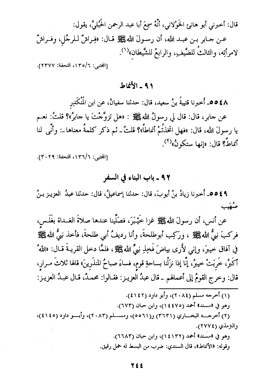 5548 - أَخْبَرَنَا قُتَيْبَةُ بْنُ سَعِيدٍ، قَالَ: حَدَّثَنَا سُفْيَانُ، عَنِ ابْنِ الْمُنْكَدِرِ، عَنْ جَابِرٍ، قَالَ: قَالَ لِي رَسُولُ اللهِ صَلَّى اللهُ عَلَيْهِ وَسَلَّمَ: «§هَلْ تَزَوَّجْتَ يَا جَابِرُ؟»، قُلْتُ: نَعَمْ يَا رَسُولَ اللهِ، قَالَ: «فَهَلِ اتَّخَذْتُمْ أَنْمَاطًا؟»، قُلْتُ: ثُمَّ ذَكَرَ كَلِمَةً مَعْنَاهَا، وَأَنَّى لَنَا أَنْمَاطٌ؟ قَالَ: «إِنَّهَا سَتَكُونُ»
