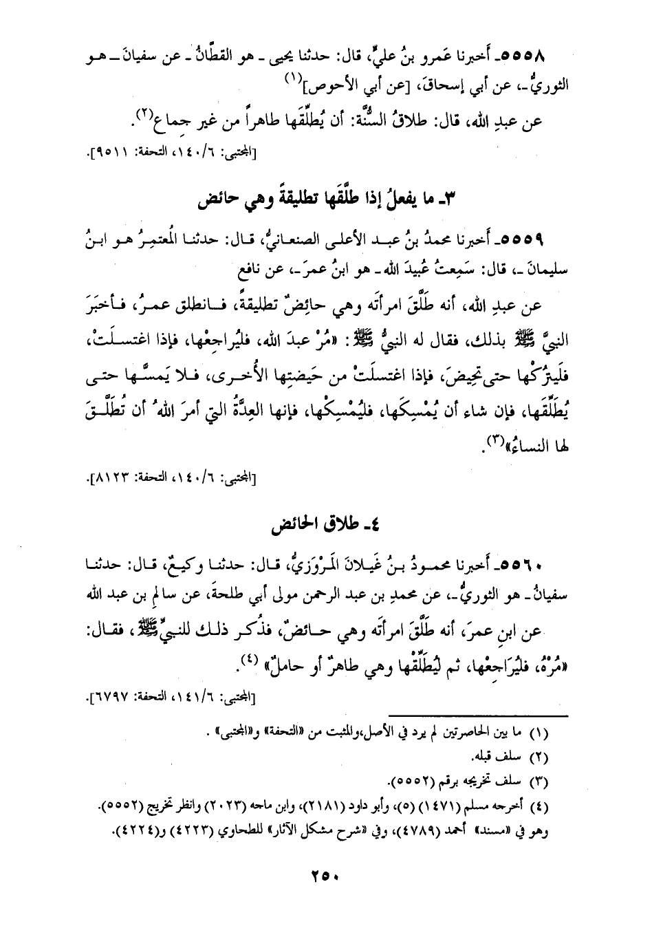 5560 - أَخْبَرَنَا مَحْمُودُ بْنُ غَيْلَانَ الْمَرْوَزِيُّ، قَالَ: حَدَّثَنَا وَكِيعٌ، قَالَ: حَدَّثَنَا سُفْيَانُ هُوَ الثَّوْرِيُّ، عَنْ مُحَمَّدِ بْنِ عَبْدِ الرَّحْمَنِ، مَوْلَى أَبِي طَلْحَةَ، عَنْ سَالِمِ بْنِ عَبْدِ اللهِ، عَنِ ابْنِ عُمَرَ، أَنَّهُ طَلَّقَ امْرَأَتَهُ، وَهِيَ حَائِضٌ فَذُكِرَ ذَلِكَ لِلنَّبِيِّ صَلَّى اللهُ عَلَيْهِ وَسَلَّمَ، فَقَالَ: «§مُرْهُ فَلْيُرَاجِعْهَا، ثُمَّ لِيُطَلِّقْهَا، وَهِيَ طَاهِرٌ أَوْ حَامِلٌ»