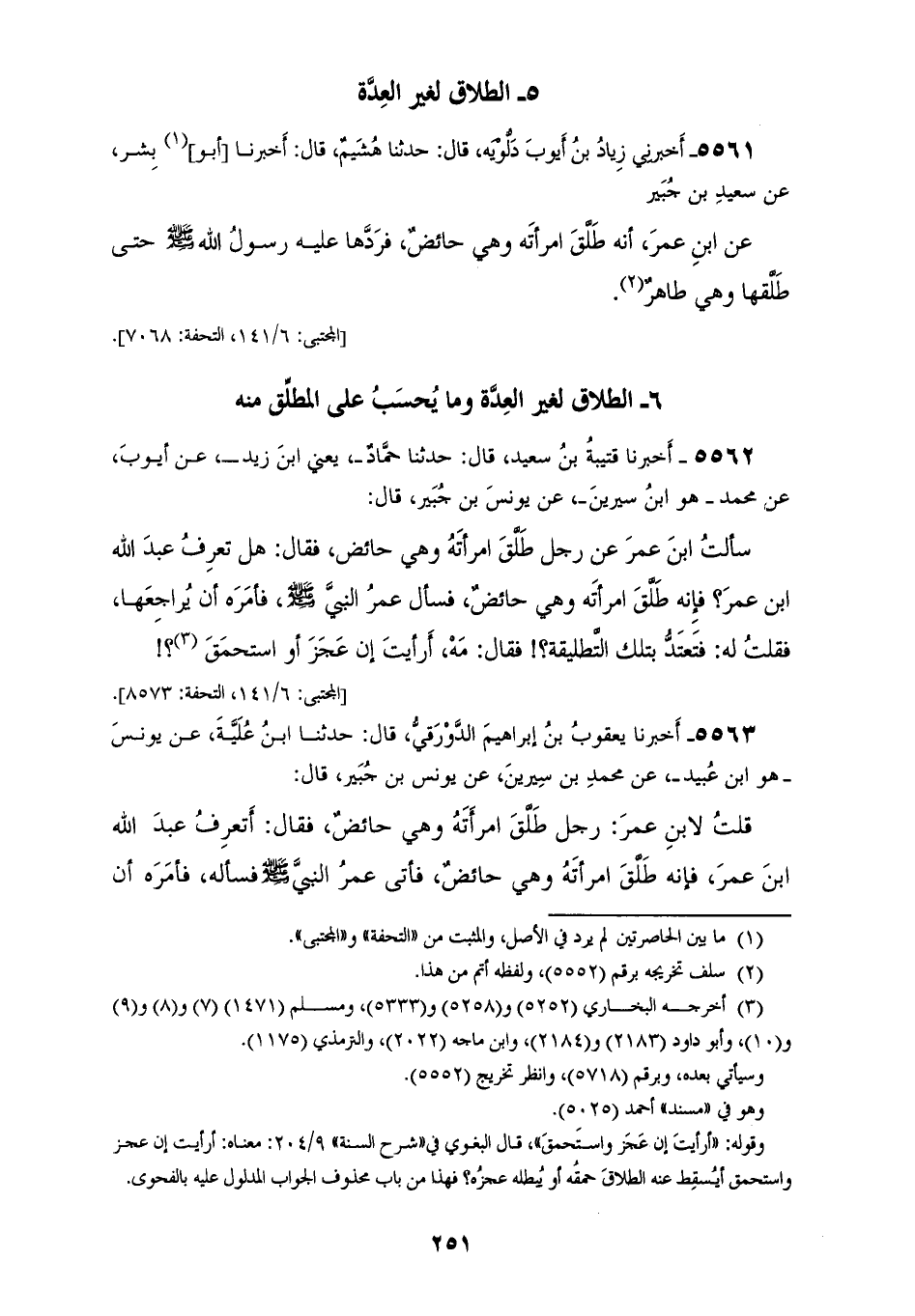 5561 - أَخْبَرَنِي زِيَادُ بْنُ أَيُّوبَ دَلُّوَيْهِ، قَالَ: حَدَّثَنَا هُشَيْمٌ، قَالَ: أَخْبَرَنَا أَبُو بِشْرٍ، عَنْ سَعِيدِ بْنِ جُبَيْرٍ، عَنِ ابْنِ عُمَرَ، أَنَّهُ طَلَّقَ امْرَأَتَهُ، وَهِيَ حَائِضٌ «§فَرَدَّهَا عَلَيْهِ رَسُولُ اللهِ صَلَّى اللهُ عَلَيْهِ وَسَلَّمَ حَتَّى طَلَّقَهَا، وَهِيَ طَاهِرٌ»