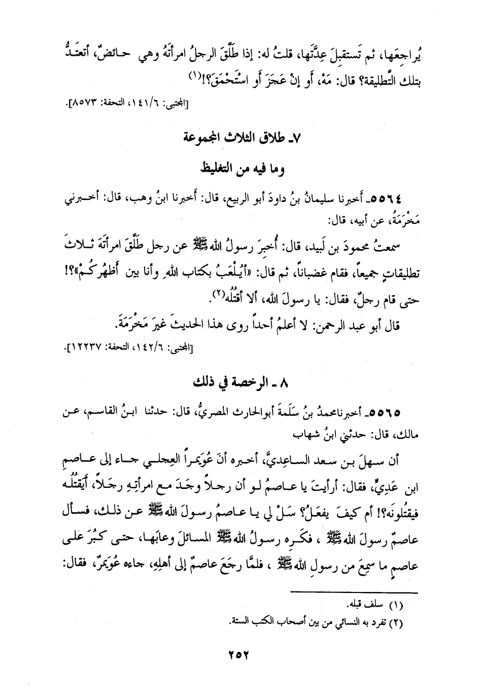 5565 - أَخْبَرَنَا مُحَمَّدُ بْنُ سَلَمَةَ أَبُو الْحَارِثِ الْمِصْرِيُّ، قَالَ: حَدَّثَنَا ابْنُ الْقَاسِمِ، عَنْ مَالِكٍ، قَالَ: حَدَّثَنِي ابْنُ شِهَابٍ، أَنَّ سَهْلَ بْنَ سَعْدٍ السَّاعِدِيَّ، أَخْبَرَهُ أَنَّ عُوَيْمِرًا الْعِجْلِيَّ جَاءَ إِلَى عَاصِمِ بْنِ عَدِيٍّ، فَقَالَ: أَرَأَيْتَ يَا عَاصِمُ لَوْ أَنَّ رَجُلًا وَجَدَ مَعَ امْرَأَتِهِ رَجُلًا أَيَقْتُلُهُ، فَيَقْتُلُونَهُ أَمْ كَيْفَ يَفْعَلُ؟ سَلْ لِي يَا عَاصِمُ رَسُولَ اللهِ صَلَّى اللهُ عَلَيْهِ وَسَلَّمَ عَنْ ذَلِكَ، فَسَأَلَ عَاصِمٌ رَسُولَ اللهِ صَلَّى اللهُ عَلَيْهِ وَسَلَّمَ §فَكَرِهَ رَسُولُ اللهِ صَلَّى اللهُ عَلَيْهِ وَسَلَّمَ الْمَسَائِلَ، وَعَابَهَا حَتَّى كَبُرَ عَلَى عَاصِمٍ مَا سَمِعَ مِنْ رَسُولِ اللهِ صَلَّى اللهُ عَلَيْهِ وَسَلَّمَ، فَلَمَّا رَجَعَ عَاصِمٌ إِلَى أَهْلِهِ جَاءَهُ عُوَيْمِرٌ، فَقَالَ: يَا عَاصِمُ مَاذَا قَالَ لَكَ رَسُولُ اللهِ صَلَّى اللهُ عَلَيْهِ وَسَلَّمَ؟، فَقَالَ عَاصِمٌ لِعُوَيْمِرٍ: لَمْ تَأْتِنِي بِخَيْرٍ قَدْ كَرِهَ رَسُولُ اللهِ صَلَّى اللهُ عَلَيْهِ وَسَلَّمَ الْمَسْأَلَةَ الَّتِي سَأَلْتُ عَنْهَا، فَقَالَ عُوَيْمِرٌ: وَاللهِ لَا أَنْتَهِي حَتَّى أَسْأَلَهُ عَنْهَا فَأَقْبَلَ عُوَيْمِرٌ حَتَّى أَتَى رَسُولَ اللهِ صَلَّى اللهُ عَلَيْهِ وَسَلَّمَ، وَسْطَ النَّاسِ، فَقَالَ: يَا رَسُولَ اللهِ أَرَأَيْتَ رَجُلًا وَجَدَ مَعَ امْرَأَتِهِ رَجُلًا أَيَقْتُلُهُ فَتَقْتُلُونَهُ أَمْ كَيْفَ يَفْعَلُ؟ فَقَالَ رَسُولُ اللهِ صَلَّى اللهُ عَلَيْهِ وَسَلَّمَ: «قَدْ نَزَلَ فِيكَ وَفِي صَاحِبَتِكَ فَاذْهَبْ فَائْتِ بِهَا»، قَالَ سَهْلٌ: فَتَلَاعَنَا وَأَنَا مَعَ النَّاسِ عِنْدَ رَسُولِ اللهِ صَلَّى اللهُ عَلَيْهِ وَسَلَّمَ، فَلَمَّا فَرَغَ قَالَ عُوَيْمِرٌ: كَذَبْتُ عَلَيْهَا يَا رَسُولَ اللهِ إِنْ أَمْسَكْتُهَا، فَطَلَّقَهَا ثَلَاثًا قَبْلَ أَنْ يَأْمُرَهُ رَسُولُ اللهِ صَلَّى اللهُ عَلَيْهِ وَسَلَّمَ