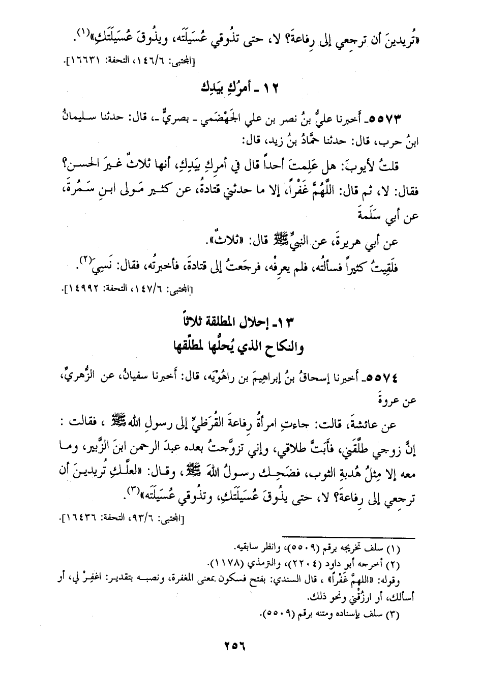 5573 - أَخْبَرَنَا عَلِيُّ بْنُ نَصْرِ بْنِ عَلِيٍّ الْجَهْضَمِيُّ بَصْرِيٌّ، قَالَ: حَدَّثَنَا سُلَيْمَانُ بْنُ حَرْبٍ، قَالَ: حَدَّثَنَا حَمَّادُ بْنُ زَيْدٍ، قَالَ: قُلْتُ لِأَيُّوبَ: هَلْ عَلِمْتَ أَحَدًا، قَالَ: فِي «§أَمْرُكِ بِيَدِكِ» أَنَّهَا ثَلَاثٌ غَيْرَ الْحَسَنِ؟، فَقَالَ: لَا، ثُمَّ قَالَ: اللهُمَّ غَفْرًا إِلَّا مَا حَدَّثَنِي قَتَادَةُ، عَنْ كَثِيرٍ مَوْلَى ابْنِ سَمُرَةَ، عَنْ أَبِي سَلَمَةَ، عَنْ أَبِي هُرَيْرَةَ عَنِ النَّبِيِّ صَلَّى اللهُ عَلَيْهِ وَسَلَّمَ قَالَ: «ثَلَاثٌ»، فَلَقِيتُ كَثِيرًا فَسَأَلْتُهُ فَلَمْ يَعْرِفْهُ فَرَجَعْتُ إِلَى قَتَادَةَ فَأَخْبَرْتُهُ، فَقَالَ: نَسِيَ