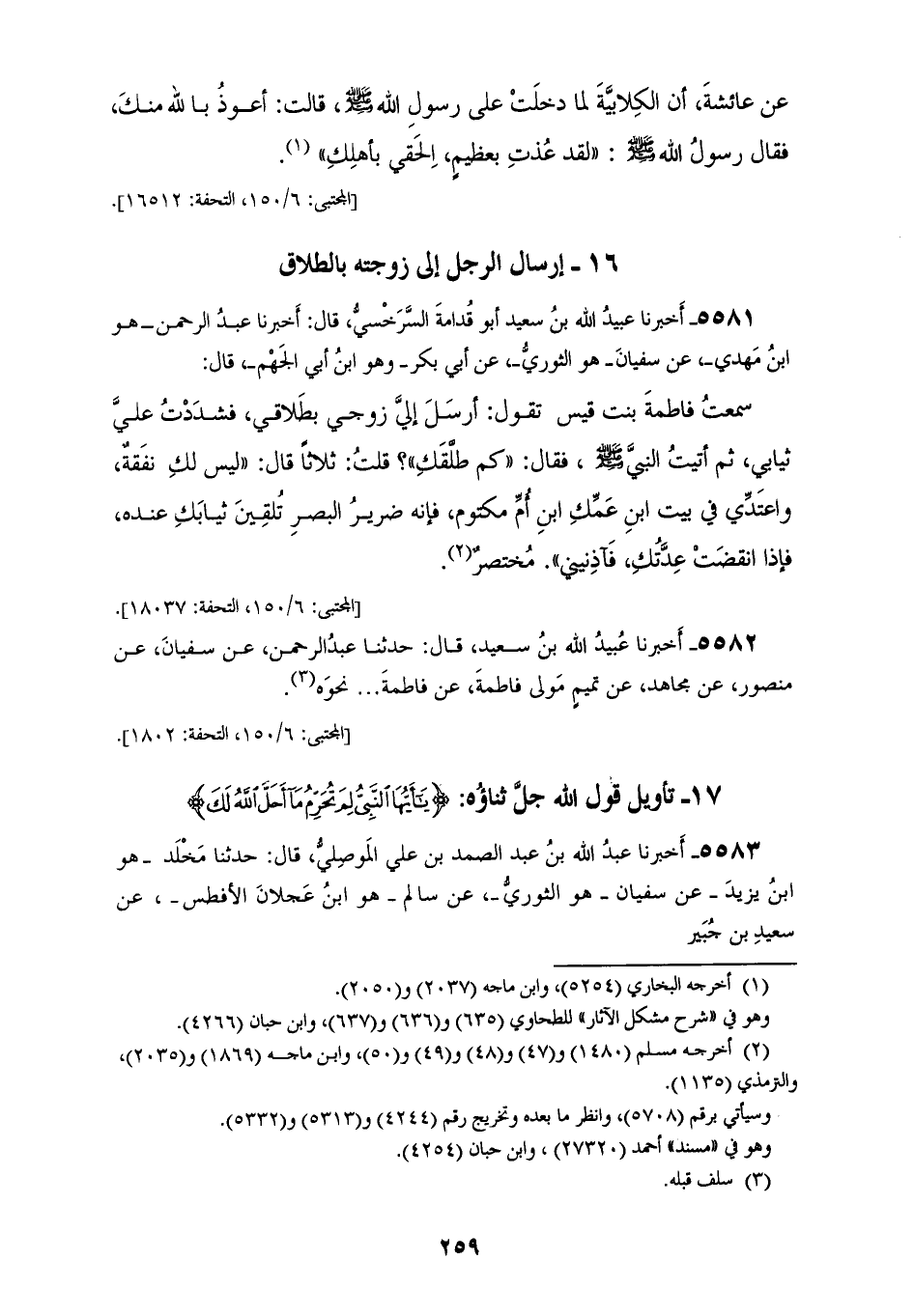 5581 - أَخْبَرَنَا عُبَيْدُ اللهِ بْنُ سَعِيدٍ أَبُو قُدَامَةَ السَّرَخْسِيُّ، قَالَ: أَخْبَرَنَا عَبْدُ الرَّحْمَنِ هُوَ ابْنُ مَهْدِيٍّ، عَنْ سُفْيَانَ هُوَ الثَّوْرِيُّ، عَنْ أَبِي بَكْرٍ وَهُوَ ابْنُ أَبِي الْجَهْمِ، قَالَ: سَمِعْتُ فَاطِمَةَ بِنْتَ قَيْسٍ، تَقُولُ: أَرْسَلَ إِلَيَّ زَوْجِي بِطَلَاقِي فَشَدَدْتُ عَلَيَّ ثِيَابِي، ثُمَّ أَتَيْتُ النَّبِيَّ صَلَّى اللهُ عَلَيْهِ وَسَلَّمَ، فَقَالَ: «§كَمْ طَلَّقَكِ؟»، فَقُلْتُ: ثَلَاثًا، قَالَ: «لَيْسَ لَكِ نَفَقَةٌ، وَاعْتَدِّي فِي بَيْتِ ابْنِ عَمِّكِ ابْنِ أُمِّ مَكْتُومٍ، فَإِنَّهُ ضَرِيرُ الْبَصَرِ تُلْقِينَ ثِيَابَكِ عِنْدَهُ، فَإِذَا انْقَضَتْ عِدَّتُكِ فَآذِنِينِي» مُخْتَصَرٌ