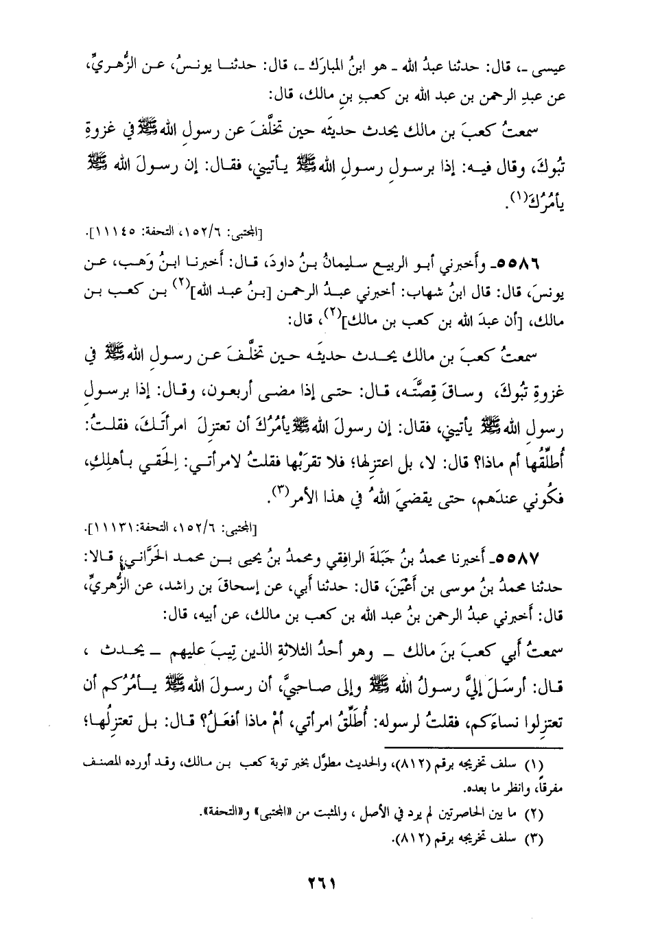 5587 - أَخْبَرَنَا مُحَمَّدُ بْنُ جَبَلَةَ الرَّافِقِيُّ، وَمُحَمَّدُ بْنُ يَحْيَى بْنِ مُحَمَّدٍ الْحَرَّانِيُّ، قَالَا: حَدَّثَنَا مُحَمَّدُ بْنُ مُوسَى بْنِ أَعْيَنَ، قَالَ: حَدَّثَنَا أَبِي، عَنْ إِسْحَاقَ بْنِ رَاشِدٍ، عَنِ الزُّهْرِيِّ، قَالَ: أَخْبَرَنِي عَبْدُ الرَّحْمَنِ بْنُ عَبْدِ اللهِ بْنِ كَعْبِ بْنِ مَالِكٍ، عَنْ أَبِيهِ، قَالَ: سَمِعْتُ أَبِي كَعْبَ بْنَ مَالِكٍ، قَالَ: وَهُوَ أَحَدُ الثَّلَاثَةِ الَّذِينَ تِيبَ عَلَيْهِمْ يُحَدِّثُ، قَالَ: أَرْسَلَ إِلَيَّ رَسُولُ اللهِ صَلَّى اللهُ عَلَيْهِ وَسَلَّمَ، وَإِلَى صَاحِبَيَّ أَنَّ رَسُولَ اللهِ صَلَّى اللهُ عَلَيْهِ وَسَلَّمَ §يَأْمُرُكُمْ أَنْ تَعْتَزِلُوا نِسَاءَكُمْ، فَقُلْتُ لِرَسُولِهِ: أُطَلِّقُ امْرَأَتِي أَمْ مَاذَا أَفْعَلُ؟، قَالَ: «لَا بَلْ تَعْتَزِلُهَا فَلَا تَقْرَبْهَا»، فَقُلْتُ لِامْرَأَتِي: الْحَقِي بِأَهْلِكِ فَكُونِي فِيهِمْ فَلَحِقَتْ بِهِمْ