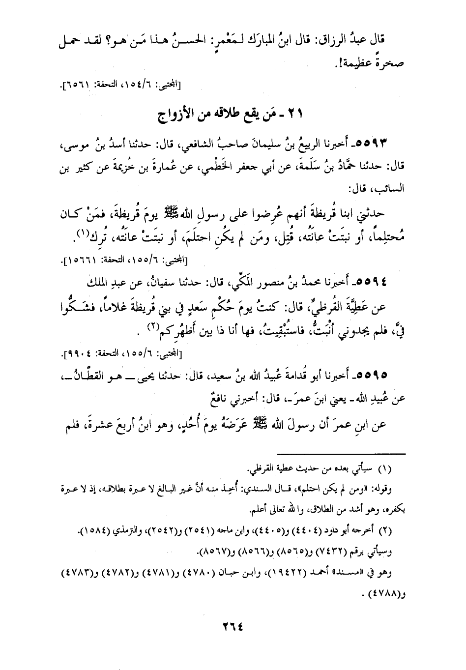 5593 - أَخْبَرَنَا الرَّبِيعُ بْنُ سُلَيْمَانَ، صَاحِبُ الشَّافِعِيِّ، قَالَ: حَدَّثَنَا أَسَدُ بْنُ مُوسَى، قَالَ: حَدَّثَنَا حَمَّادُ بْنُ سَلَمَةَ، عَنْ أَبِي جَعْفَرٍ الْخَطْمِيِّ، عَنْ عُمَارَةَ بْنِ خُزَيْمَةَ، عَنْ كَثِيرِ بْنِ السَّائِبِ، قَالَ: حَدَّثَنِي ابْنَا قُرَيْظَةَ أَنَّهُمْ عُرِضُوا عَلَى رَسُولِ اللهِ صَلَّى اللهُ عَلَيْهِ وَسَلَّمَ يَوْمَ قُرَيْظَةَ، «§فَمَنْ كَانَ مُحْتَلِمًا أَوْ نَبَتَتْ عَانَتُهُ قُتِلَ، وَمَنْ لَمْ يَكُنِ احْتَلَمَ أَوْ لَمْ تَنْبُتْ عَانَتُهُ تُرِكَ»