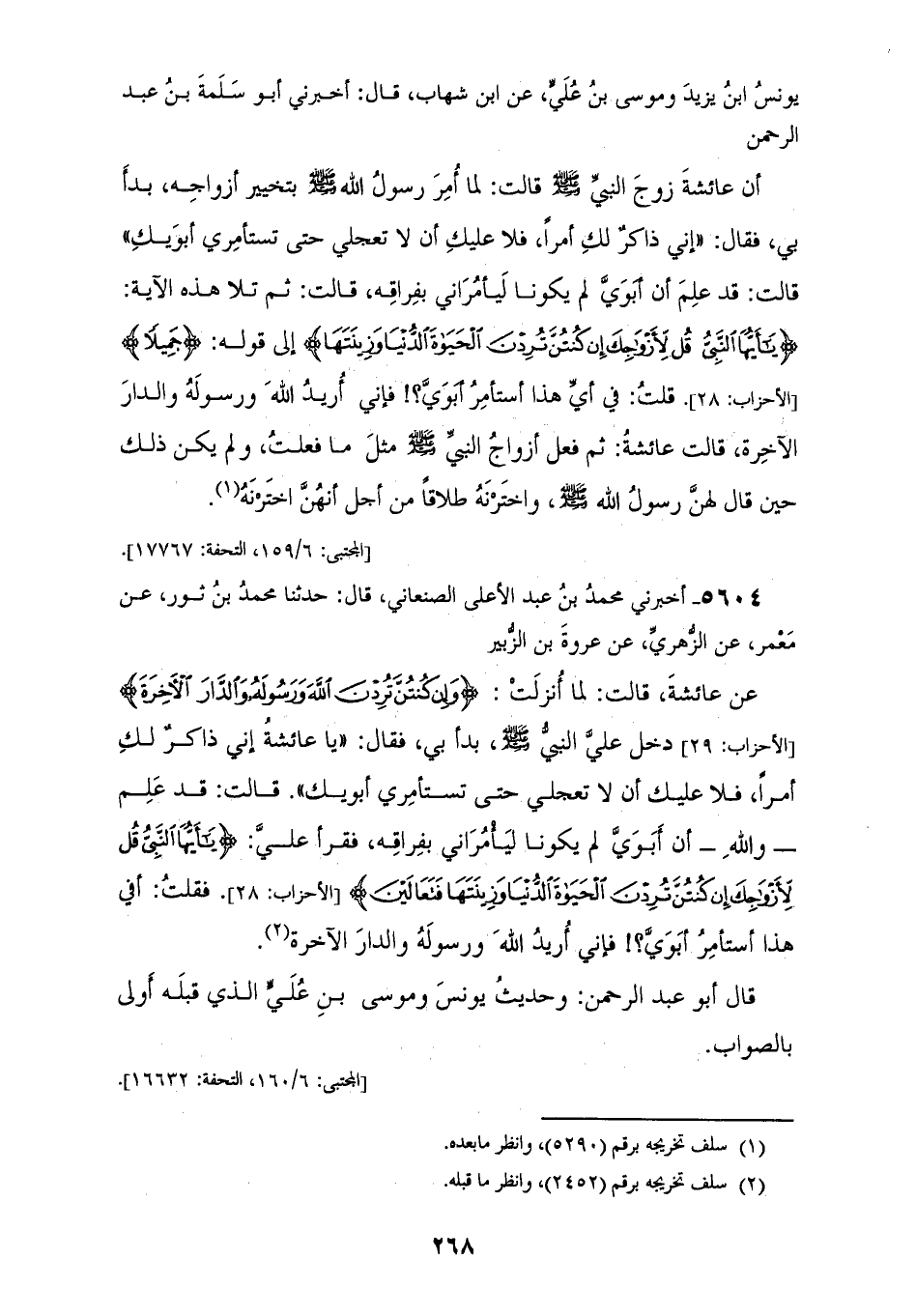 5603 - أَخْبَرَنَا يُونُسُ بْنُ عَبْدِ الْأَعْلَى، قَالَ: حَدَّثَنَا ابْنُ وَهْبٍ، قَالَ: أَخْبَرَنِي يُونُسُ بْنُ يَزِيدَ، وَمُوسَى بْنُ عَلِيٍّ، عَنِ ابْنِ شِهَابٍ، قَالَ: أَخْبَرَنِي أَبُو سَلَمَةَ بْنُ عَبْدِ الرَّحْمَنِ، أَنَّ عَائِشَةَ، زَوْجَ النَّبِيِّ صَلَّى اللهُ عَلَيْهِ وَسَلَّمَ قَالَتْ: لَمَّا أُمِرَ رَسُولُ اللهِ صَلَّى اللهُ عَلَيْهِ وَسَلَّمَ بِتَخْيِيرِ أَزْوَاجِهِ بَدَأَ بِي، فَقَالَ: «§إِنِّي ذَاكِرٌ لَكِ أَمْرًا فَلَا عَلَيْكِ أَنْ لَا تَعْجَلِي حَتَّى تَسْتَأْمِرِي أَبَوَيْكِ»، قَالَتْ: قَدْ عَلِمَ أَنَّ أَبَوَيَّ لَمْ يَكُونَا لِيَأْمُرَانِّي بِفِرَاقِهِ، قَالَتْ: ثُمَّ تَلَا هَذِهِ الْآيَةَ {يَا أَيُّهَا النَّبِيُّ قُلْ لِأَزْوَاجِكَ إِنْ كُنْتُنَّ تُرِدْنَ الْحَيَاةَ الدُّنْيَا وَزِينَتَهَا} [الأحزاب: 28] إِلَى قَوْلِهِ: {جَمِيلًا} [الأحزاب: 28]، قُلْتُ: فِي أَيِّ هَذَا أَسْتَأْمِرُ أَبَوَيَّ، فَإِنِّي أُرِيدُ اللهَ وَرَسُولَهُ وَالدَّارَ الْآخِرَةَ، قَالَتْ عَائِشَةُ: ثُمَّ فَعَلَ أَزْوَاجُ النَّبِيِّ صَلَّى اللهُ عَلَيْهِ وَسَلَّمَ مِثْلَ مَا فَعَلْتُ، وَلَمْ يَكُنْ ذَلِكَ حِينَ قَالَ: لَهُنَّ رَسُولُ اللهِ صَلَّى اللهُ عَلَيْهِ وَسَلَّمَ وَاخْتَرْنَهُ طَلَاقًا مِنْ أَجْلِ أَنَّهُنَّ اخْتَرْنَهُ