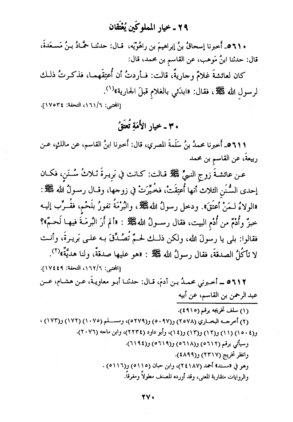 5610 - أَخْبَرَنَا إِسْحَاقُ بْنُ إِبْرَاهِيمَ بْنِ رَاهَوَيْهِ، قَالَ: حَدَّثَنَا حَمَّادُ بْنُ مَسْعَدَةَ، قَالَ: حَدَّثَنَا ابْنُ مَوْهِبٍ، عَنِ الْقَاسِمِ بْنِ مُحَمَّدٍ، قَالَ: كَانَ لِعَائِشَةَ غُلَامٌ وَجَارِيَةٌ، قَالَتْ: فَأَرَدْتُ أَنْ أُعْتِقَهُمَا فَذَكَرْتُ ذَلِكَ لِرَسُولِ اللهِ صَلَّى اللهُ عَلَيْهِ وَسَلَّمَ، فَقَالَ: «§ابْدَئِي بِالْغُلَامِ قَبْلَ الْجَارِيَةِ»