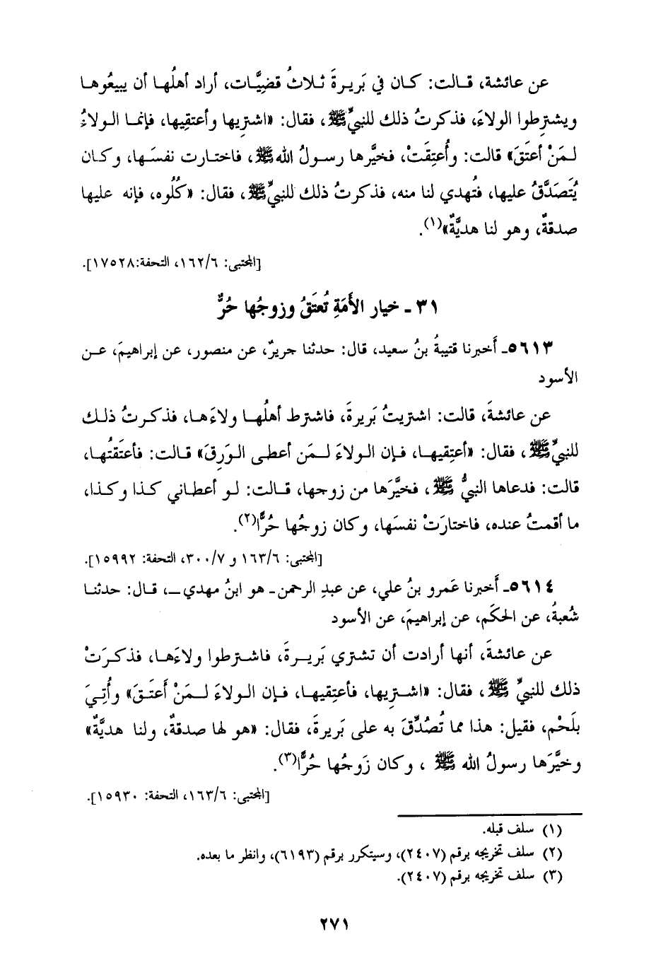 5614 - أَخْبَرَنَا عَمْرُو بْنُ عَلِيٍّ، عَنْ عَبْدِ الرَّحْمَنِ هُوَ ابْنُ مَهْدِيٍّ، قَالَ: حَدَّثَنَا شُعْبَةُ، عَنِ الْحَكَمِ، عَنْ إِبْرَاهِيمَ، عَنِ الْأَسْوَدِ، عَنْ عَائِشَةَ، أَنَّهَا أَرَادَتْ أَنْ تَشْتَرِيَ، بَرِيرَةَ، فَاشْتَرَطُوا وَلَاءَهَا، فَذَكَرْتُ ذَلِكَ لِلنَّبِيِّ صَلَّى اللهُ عَلَيْهِ وَسَلَّمَ، فَقَالَ: «§اشْتَرِيهَا فَأَعْتِقِيهَا فَإِنَّ الْوَلَاءَ لِمَنْ أَعْتَقَ»، وَأُتِيَ بِلَحْمٍ فَقِيلَ إِنَّ هَذَا مِمَّا تُصُدِّقَ بِهِ عَلَى بَرِيرَةَ، فَقَالَ: «هُوَ لَهَا صَدَقَةٌ وَلَنَا هَدِيَّةٌ» وَخَيَّرَهَا رَسُولُ اللهِ صَلَّى اللهُ عَلَيْهِ وَسَلَّمَ وَكَانَ زَوْجُهَا حُرًّا