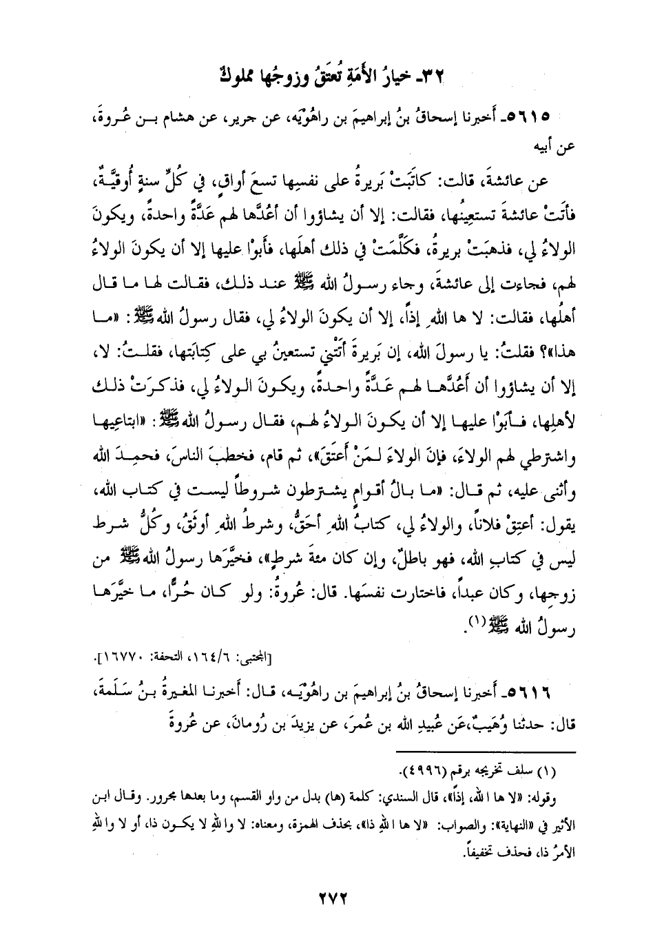 5615 - أَخْبَرَنَا إِسْحَاقُ بْنُ إِبْرَاهِيمَ بْنِ رَاهَوَيْهِ، قَالَ: عَنْ جَرِيرٌ، عَنْ هِشَامِ بْنِ عُرْوَةَ، عَنْ أَبِيهِ، عَنْ عَائِشَةَ، قَالَتْ: كَاتَبْتُ بَرِيرَةَ عَلَى نَفْسِهَا تِسْعَ أَوَاقٍ فِي كُلِّ سَنَةٍ أُوقِيَّةٌ، فَأَتَتْ عَائِشَةَ تَسْتَعِينُهَا، فَقَالَتْ: إِلَّا أَنْ يَشَاءُوا أَنْ أَعُدَّهَا لَهُمْ عَدَّةً وَاحِدَةً، وَيَكُونُ الْوَلَاءُ لِي، فَذَهَبَتْ بَرِيرَةُ فَكَلَّمَتْ فِي ذَلِكَ أَهْلَهَا، فَأَبَوْا عَلَيْهَا إِلَّا أَنْ يَكُونَ الْوَلَاءُ لَهُمْ، فَجَاءَتْ إِلَى عَائِشَةَ وَجَاءَ رَسُولُ اللهِ صَلَّى اللهُ عَلَيْهِ وَسَلَّمَ عِنْدَ ذَلِكَ، فَقَالَتْ لَهَا: مَا قَالَ أَهْلُهَا، فَقَالَتْ: لَاهَا اللهُ إِذًا إِلَّا أَنْ يَكُونَ الْوَلَاءُ لِي، فَقَالَ رَسُولُ اللهِ صَلَّى اللهُ عَلَيْهِ وَسَلَّمَ: «§مَا هَذَا؟»، فَقُلْتُ: يَا رَسُولَ اللهِ إِنَّ بَرِيرَةَ أَتَتْنِي تَسْتَعِينُ بِي عَلَى كِتَابَتِهَا، فَقُلْتُ: لَا إِلَّا أَنْ يَشَاءُوا أَنْ أَعُدَّهَا لَهُمْ عَدَّةً وَاحِدَةً وَيَكُونُ الْوَلَاءُ لِي، فَذَكَرَتْ ذَلِكَ لِأَهْلِهَا فَأَبَوْا عَلَيْهَا إِلَّا أَنْ يَكُونَ الْوَلَاءُ لَهُمْ، فَقَالَ رَسُولُ اللهِ صَلَّى اللهُ عَلَيْهِ وَسَلَّمَ: «ابْتَاعِيهَا وَاشْتَرِطِي لَهُمُ الْوَلَاءُ فَإِنَّ الْوَلَاءَ لِمَنْ أَعْتَقَ»، ثُمَّ قَامَ فَخَطَبَ النَّاسَ فَحَمِدَ اللهَ وَأَثْنَى عَلَيْهِ، ثُمَّ قَالَ: «مَا بَالُ أَقْوَامٍ يَشْتَرِطُونَ شُرُوطًا لَيْسَتْ فِي كِتَابِ اللهِ يَقُولُونَ أَعْتِقْ فُلَانًا، وَالْوَلَاءُ لِي كِتَابُ اللهِ أَحَقُّ، وَشَرْطُ اللهِ أَوْثَقُ، وَكُلُّ شَرْطٍ لَيْسَ فِي كِتَابِ اللهِ فَهُوَ بَاطِلٌ، وَإِنْ كَانَ مِائَةَ شَرْطٍ»، فَخَيَّرَهَا رَسُولُ اللهِ صَلَّى اللهُ عَلَيْهِ وَسَلَّمَ مِنْ زَوْجِهَا، وَكَانَ عَبْدًا فَاخْتَارَتْ نَفْسَهَا، قَالَ عُرْوَةُ: وَلَوْ كَانَ حُرًّا مَا خَيَّرَهَا رَسُولُ اللهِ صَلَّى اللهُ عَلَيْهِ وَسَلَّمَ