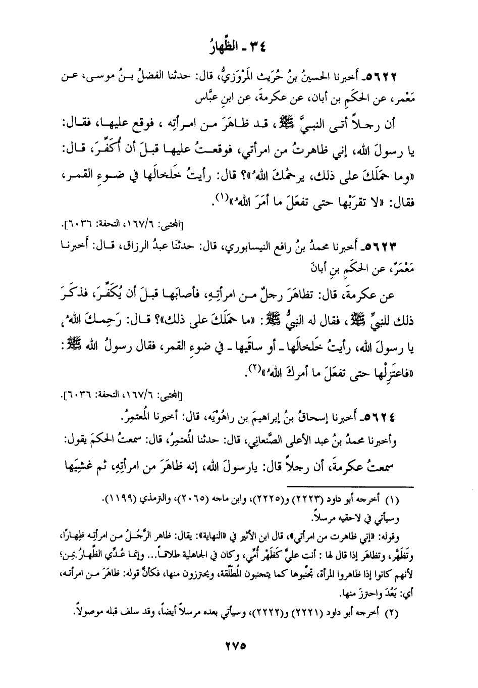 5623 - أَخْبَرَنَا مُحَمَّدُ بْنُ رَافِعٍ النَّيْسَابُورِيُّ، قَالَ: حَدَّثَنَا عَبْدُ الرَّزَّاقِ، قَالَ: أَخْبَرَنَا مَعْمَرٌ، عَنِ الْحَكَمِ بْنِ أَبَانَ، عَنْ عِكْرِمَةَ، قَالَ: تَظَاهَرَ رَجُلٌ مِنَ امْرَأَتِهِ، فَأَصَابَهَا قَبْلَ أَنْ يُكَفِّرَ، فَذَكَرَ ذَلِكَ لِلنَّبِيِّ صَلَّى اللهُ عَلَيْهِ وَسَلَّمَ، فَقَالَ لَهُ النَّبِيُّ صَلَّى اللهُ عَلَيْهِ وَسَلَّمَ: «§مَا حَمَلَكَ عَلَى ذَلِكَ؟»، قَالَ: رَحِمَكَ اللهُ يَا رَسُولَ اللهِ رَأَيْتُ خَلْخَالَهَا أَوْ سَاقَيْهَا فِي ضَوْءِ الْقَمَرِ، فَقَالَ رَسُولُ اللهِ صَلَّى اللهُ عَلَيْهِ وَسَلَّمَ: «فَاعْتَزِلْهَا حَتَّى تَفْعَلَ مَا أَمَرَكَ اللهُ»