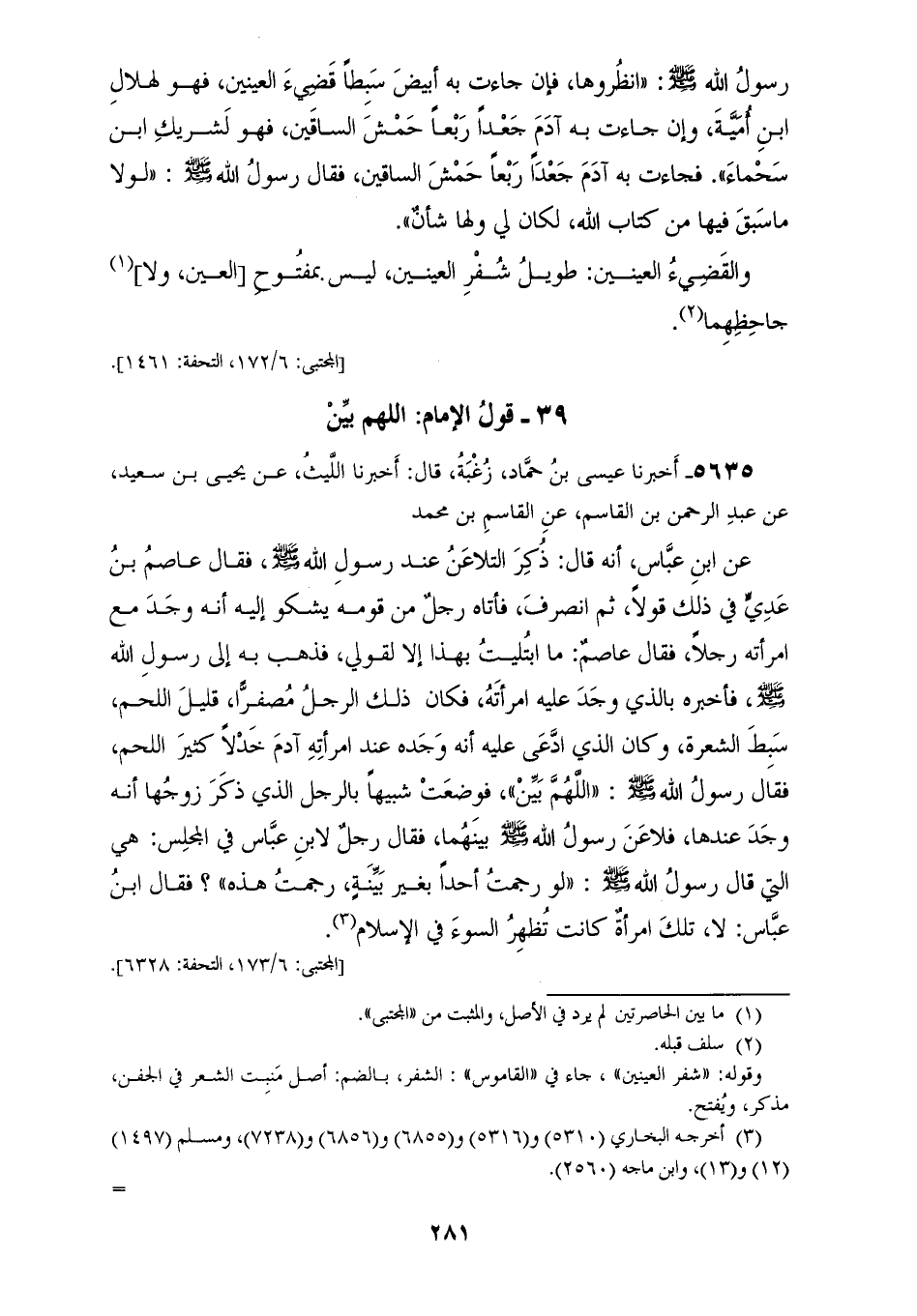 5635 - أَخْبَرَنَا عِيسَى بْنُ حَمَّادٍ زُغْبَةُ، قَالَ: أَخْبَرَنَا اللَّيْثُ، عَنْ يَحْيَى بْنِ سَعِيدٍ، عَنْ عَبْدِ الرَّحْمَنِ بْنِ الْقَاسِمِ، عَنِ الْقَاسِمِ بْنِ مُحَمَّدٍ، عَنِ ابْنِ عَبَّاسٍ، أَنَّهُ قَالَ: ذُكِرَ التَّلَاعُنُ عِنْدَ رَسُولِ اللهِ صَلَّى اللهُ عَلَيْهِ وَسَلَّمَ، فَقَالَ عَاصِمُ بْنُ عَدِيٍّ فِي ذَلِكَ قَوْلًا ثُمَّ انْصَرَفَ، فَأَتَاهُ رَجُلٌ مِنْ قَوْمِهِ يَشْكُو إِلَيْهِ أَنَّهُ وَجَدَ مَعَ امْرَأَتِهِ رَجُلًا، فَقَالَ عَاصِمٌ: مَا ابْتُلِيتُ بِهَذَا إِلَّا لِقَوْلِي، فَذَهَبَ بِهِ إِلَى رَسُولِ اللهِ صَلَّى اللهُ عَلَيْهِ وَسَلَّمَ، فَأَخْبَرَهُ بِالَّذِي وَجَدَ عَلَيْهِ امْرَأَتَهُ، فَكَانَ ذَلِكَ الرَّجُلُ مُصْفَرًّا قَلِيلَ اللَّحْمِ سَبِطَ الشَّعْرَةِ، وَكَانَ الَّذِي ادَّعَى عَلَيْهِ أَنَّهُ وَجَدَهُ عِنْدَ امْرَأَتِهِ آدَمَ خَدْلًا كَثِيرَ اللَّحْمِ، فَقَالَ رَسُولُ اللهِ صَلَّى اللهُ عَلَيْهِ وَسَلَّمَ: «§اللهُمَّ بَيِّنْ»، فَوَضَعَتْ شَبِيهًا بِالرَّجُلِ الَّذِي ذَكَرَ زَوْجُهَا أَنَّهُ وَجَدَهُ عِنْدَهَا، فَلَاعَنَ رَسُولُ اللهِ صَلَّى اللهُ عَلَيْهِ وَسَلَّمَ بَيْنَهُمَا، فَقَالَ رَجُلٌ لِابْنِ عَبَّاسٍ فِي الْمَجْلِسِ: هِيَ الَّتِي قَالَ رَسُولُ اللهِ صَلَّى اللهُ عَلَيْهِ وَسَلَّمَ: «لَوْ رَجَمْتُ أَحَدًا بِغَيْرِ بَيِّنَةٍ رَجَمْتُ هَذِهِ»؟ فَقَالَ ابْنُ عَبَّاسٍ: لَا تِلْكَ امْرَأَةٌ كَانَتْ تُظْهِرُ السَّوءَ فِي الْإِسْلَامِ