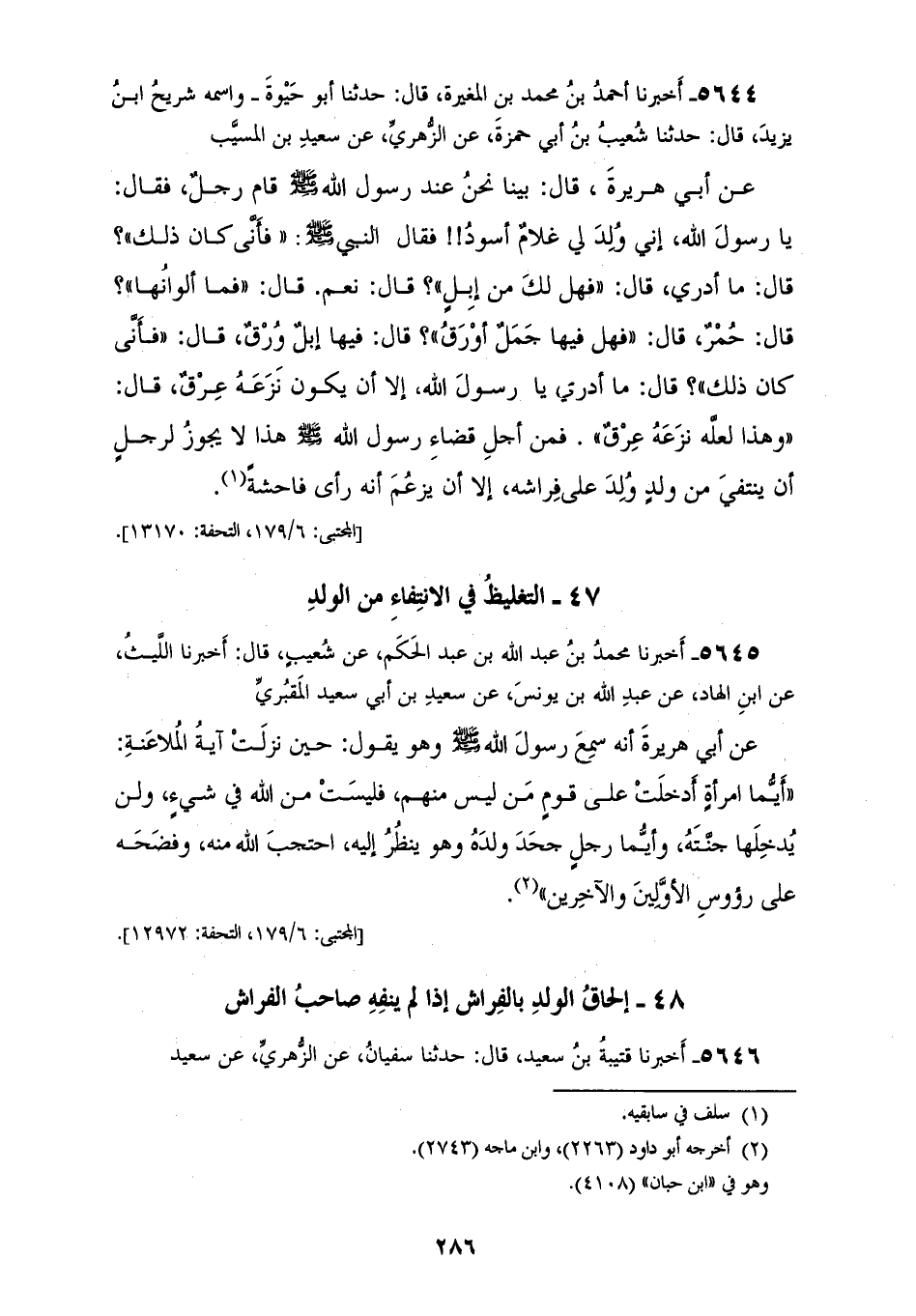 5644 - أَخْبَرَنَا أَحْمَدُ بْنُ مُحَمَّدِ بْنِ الْمُغِيرَةِ، قَالَ: حَدَّثَنَا أَبُو حَيْوَةَ حِمْصِيٌّ وَاسْمُهُ شُرَيْحُ بْنُ يَزِيدَ، قَالَ: حَدَّثَنَا شُعَيْبُ بْنُ أَبِي حَمْزَةَ، عَنِ الزُّهْرِيِّ، عَنْ سَعِيدِ بْنِ الْمُسَيِّبِ، عَنْ أَبِي هُرَيْرَةَ، قَالَ: بَيْنَمَا نَحْنُ عِنْدَ رَسُولِ اللهِ صَلَّى اللهُ عَلَيْهِ وَسَلَّمَ قَامَ رَجُلٌ، فَقَالَ: يَا رَسُولَ اللهِ إِنِّي وُلِدَ لِي غُلَامٌ أَسْوَدُ، فَقَالَ النَّبِيُّ صَلَّى اللهُ عَلَيْهِ وَسَلَّمَ: «§فَأَنَّى كَانَ ذَلِكَ؟»، قَالَ: مَا أَدْرِي، قَالَ: «فَهَلْ لَكَ مِنْ إِبِلٍ؟»، قَالَ: نَعَمْ، قَالَ: «فَمَا أَلْوَانُهَا؟»، قَالَ: حُمْرٌ، قَالَ: «فَهَلْ فِيهَا جَمَلٌ أَوْرَقُ؟»، قَالَ: فِيهَا إِبِلٌ وُرْقٌ، قَالَ: «فَأَنَّى كَانَ ذَلِكَ؟»، قَالَ: مَا أَدْرِي يَا رَسُولَ اللهِ إِلَّا أَنْ يَكُونَ نَزَعَهُ عِرْقٌ، قَالَ: «وَهَذَا لَعَلَّهُ نَزَعَهُ عِرْقٌ» فَمِنْ أَجْلِهِ «قَضَى رَسُولُ اللهِ صَلَّى اللهُ عَلَيْهِ وَسَلَّمَ هَذَا لَا يَجُوزُ لِرَجُلٍ أَنْ يَنْتَفِيَ مِنْ وَلَدٍ وُلِدَ عَلَى فِرَاشِهِ، إِلَّا أَنْ يَزْعُمَ أَنَّهُ رَأَى فَاحِشَةً»