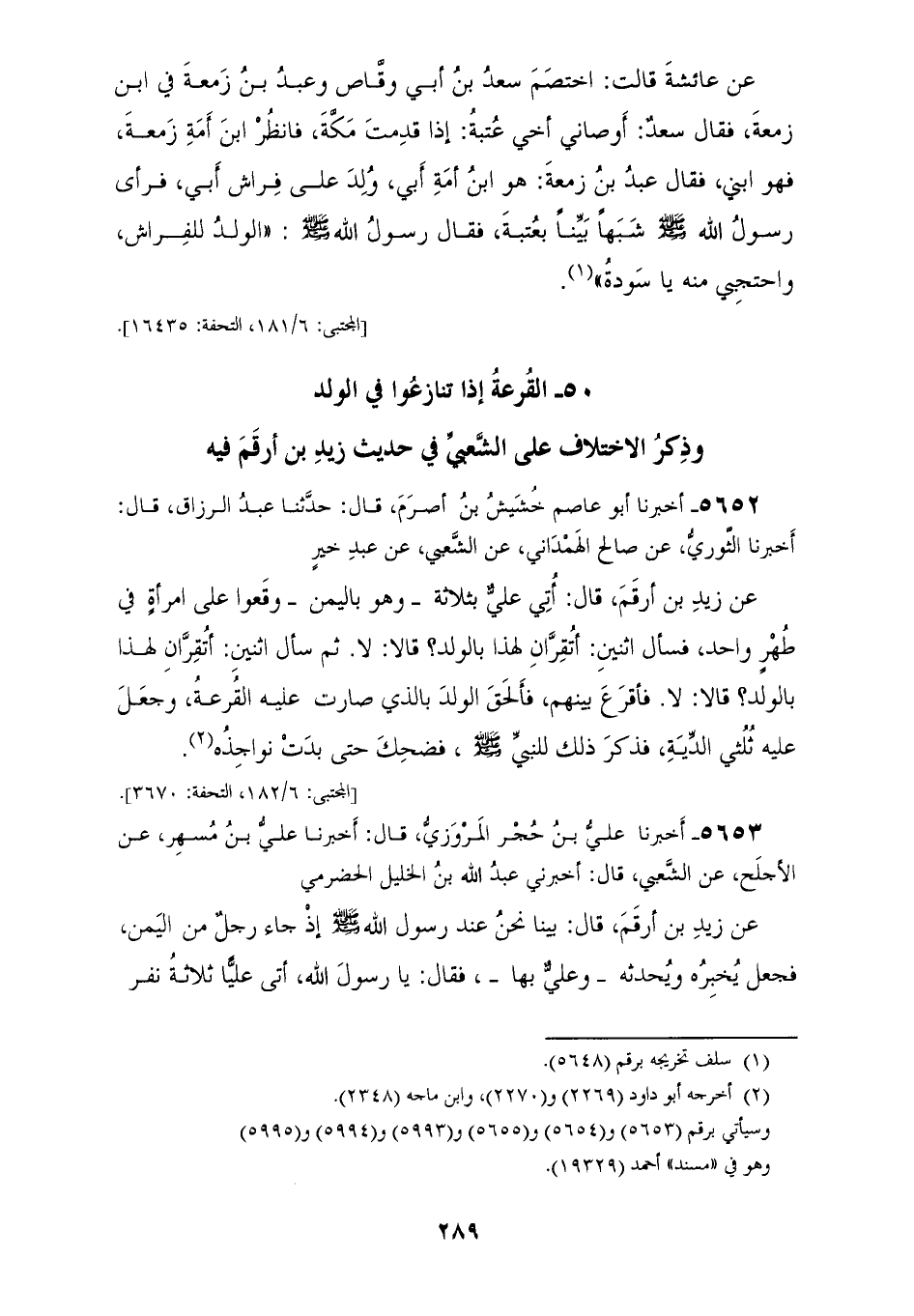 5652 - أَخْبَرَنَا أَبُو عَاصِمٍ خَشِيشُ بْنُ أَصْرَمَ، قَالَ: حَدَّثَنَا عَبْدُ الرَّزَّاقِ، قَالَ: أَخْبَرَنَا الثَّوْرِيُّ، عَنْ صَالِحٍ الْهَمْدَانِيِّ، عَنِ الشَّعْبِيِّ، عَنْ عَبْدِ خَيْرٍ، عَنْ زَيْدِ بْنِ أَرْقَمَ، قَالَ: أُتِيَ عَلِيٌّ بِثَلَاثَةٍ، وَهُوَ بِالْيَمَنِ، وَقَعُوا عَلَى امْرَأَةٍ فِي طُهْرٍ وَاحِدٍ، فَسَأَلَ اثْنَيْنِ: §أَتُقِرَّانِ لِهَذَا بِالْوَلَدِ؟ قَالَا: لَا، ثُمَّ سَأَلَ اثْنَيْنِ: أَتُقِرَّانِ لِهَذَا بِالْوَلَدِ؟ قَالَا: لَا، فَأَقْرَعَ بَيْنَهُمْ، فَأَلْحَقَ الْوَلَدَ بِالَّذِي صَارَتْ عَلَيْهِ الْقُرْعَةُ، وَجَعَلَ عَلَيْهِ ثُلُثَيِ الدِّيَةِ، فَذُكِرَ ذَلِكَ لِلنَّبِيِّ صَلَّى اللهُ عَلَيْهِ وَسَلَّمَ، فَضَحِكَ حَتَّى بَدَتْ نَوَاجِذُهُ ".