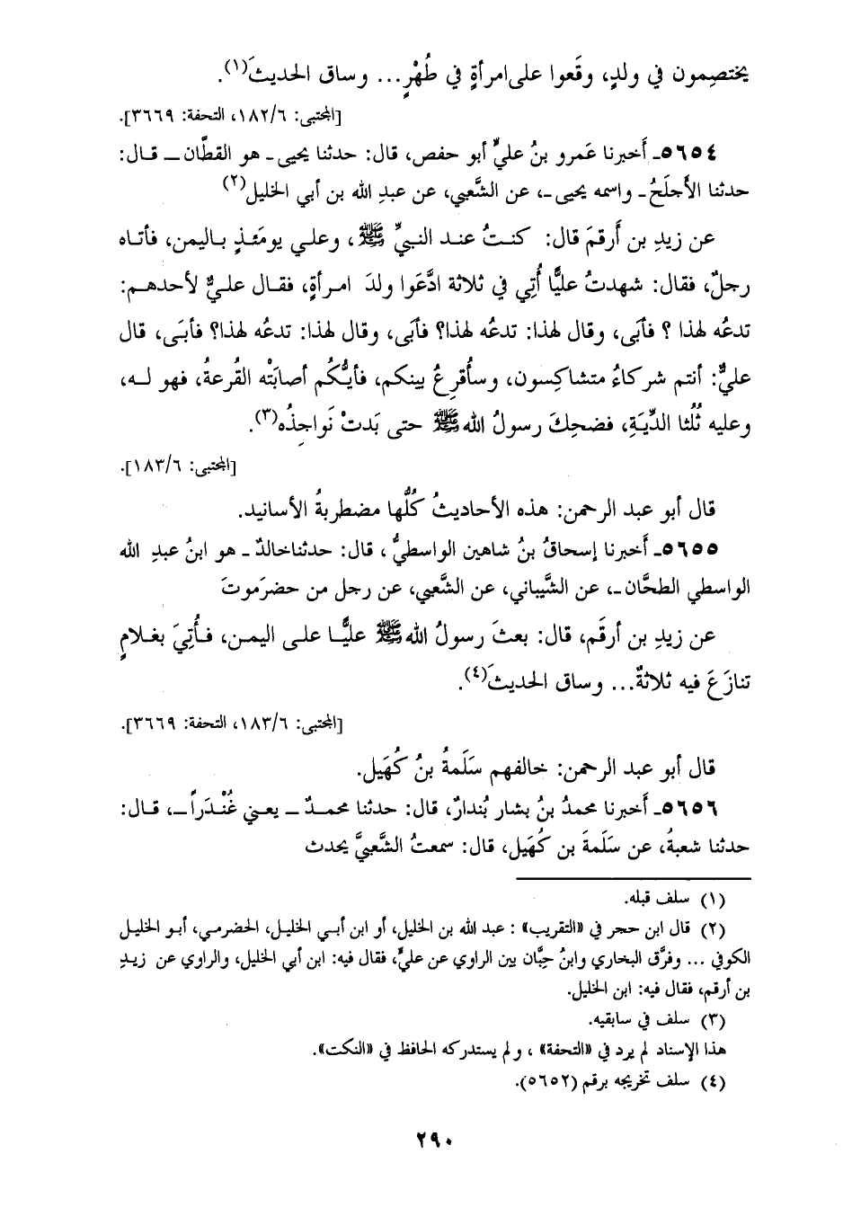 5655 - أَخْبَرَنَا إِسْحَاقُ بْنُ شَاهِينَ هُوَ الْوَاسِطِيُّ، قَالَ: حَدَّثَنَا خَالِدٌ هُوَ ابْنُ عَبْدِ اللهِ الْوَاسِطِيُّ الطَّحَّانُ، عَنِ الشَّيْبَانِيِّ، عَنِ الشَّعْبِيِّ، عَنْ رَجُلٍ، مِنْ حَضْرَمَوْتَ، عَنْ زَيْدِ بْنِ أَرْقَمَ، قَالَ: «§بَعَثَ رَسُولُ اللهِ صَلَّى اللهُ عَلَيْهِ وَسَلَّمَ عَلِيًّا عَلَى الْيَمَنِ، فَأُتِيَ بِغُلَامٍ تَنَازَعَ فِيهِ ثَلَاثَةٌ. . . .» وَسَاقَ الْحَدِيثَ، قَالَ أَبُو عَبْدِ الرَّحْمَنِ: خَالَفَهُمْ سَلَمَةُ بْنُ كُهَيْلٍ