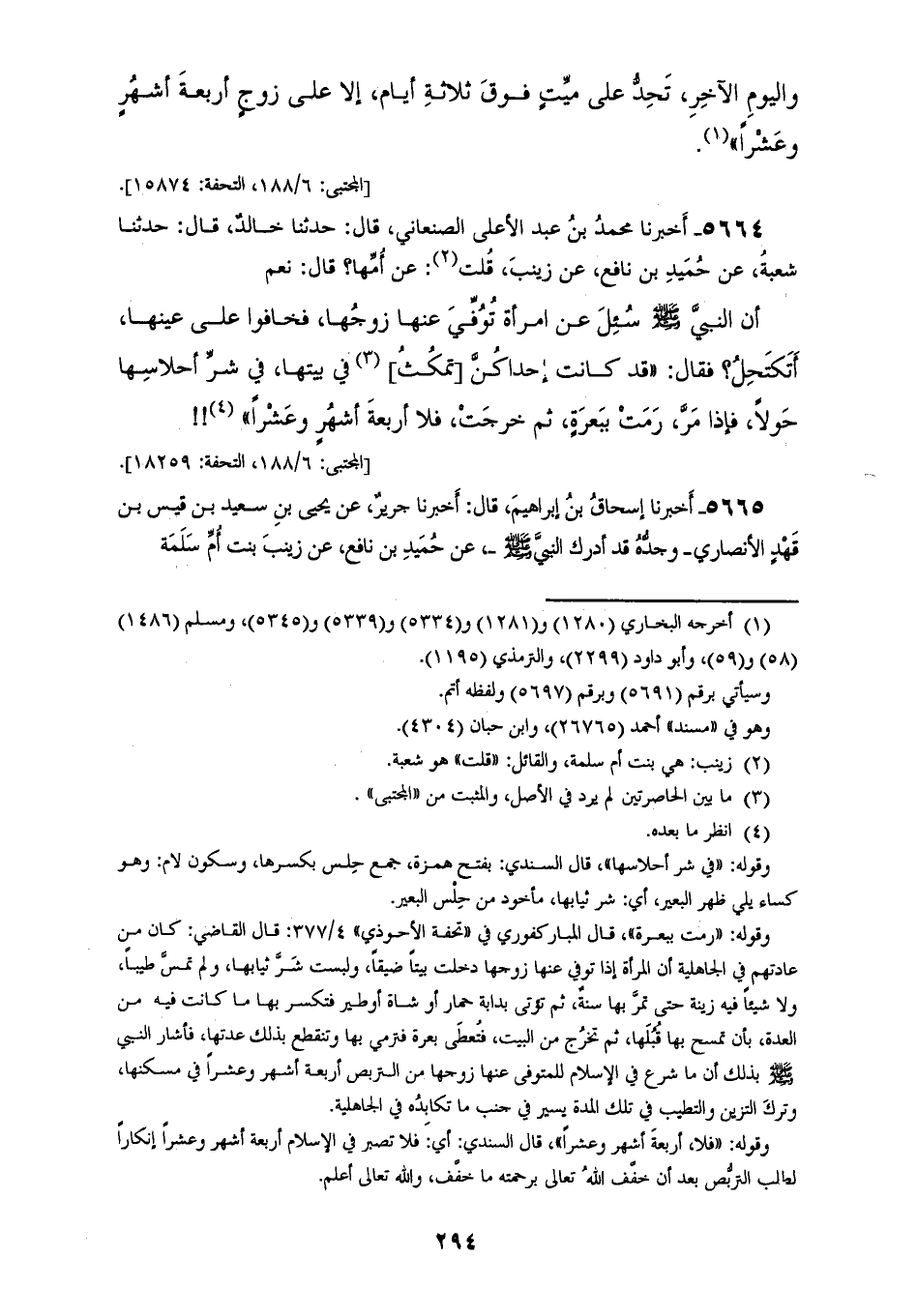 5663 - أَخْبَرَنَا هَنَّادُ بْنُ السَّرِيِّ الْكُوفِيُّ، عَنْ وَكِيعٍ، عَنْ شُعْبَةَ، قَالَ: حَدَّثَنِي حُمَيْدُ بْنُ نَافِعٍ، عَنْ زَيْنَبَ بِنْتِ أُمِّ سَلَمَةَ، قَالَتْ أُمُّ حَبِيبَةَ: سَمِعْتُ رَسُولَ اللهِ صَلَّى اللهُ عَلَيْهِ وَسَلَّمَ يَقُولُ: «§لَا يَحِلُّ لِامْرَأَةٍ تُؤْمِنُ بِاللهِ وَالْيَوْمِ الْآخِرِ تُحِدُّ عَلَى مَيِّتٍ، فَوْقَ ثَلَاثَةِ أَيَّامٍ إِلَّا عَلَى زَوْجٍ أَرْبَعَةَ أَشْهُرٍ وَعَشْرًا»
