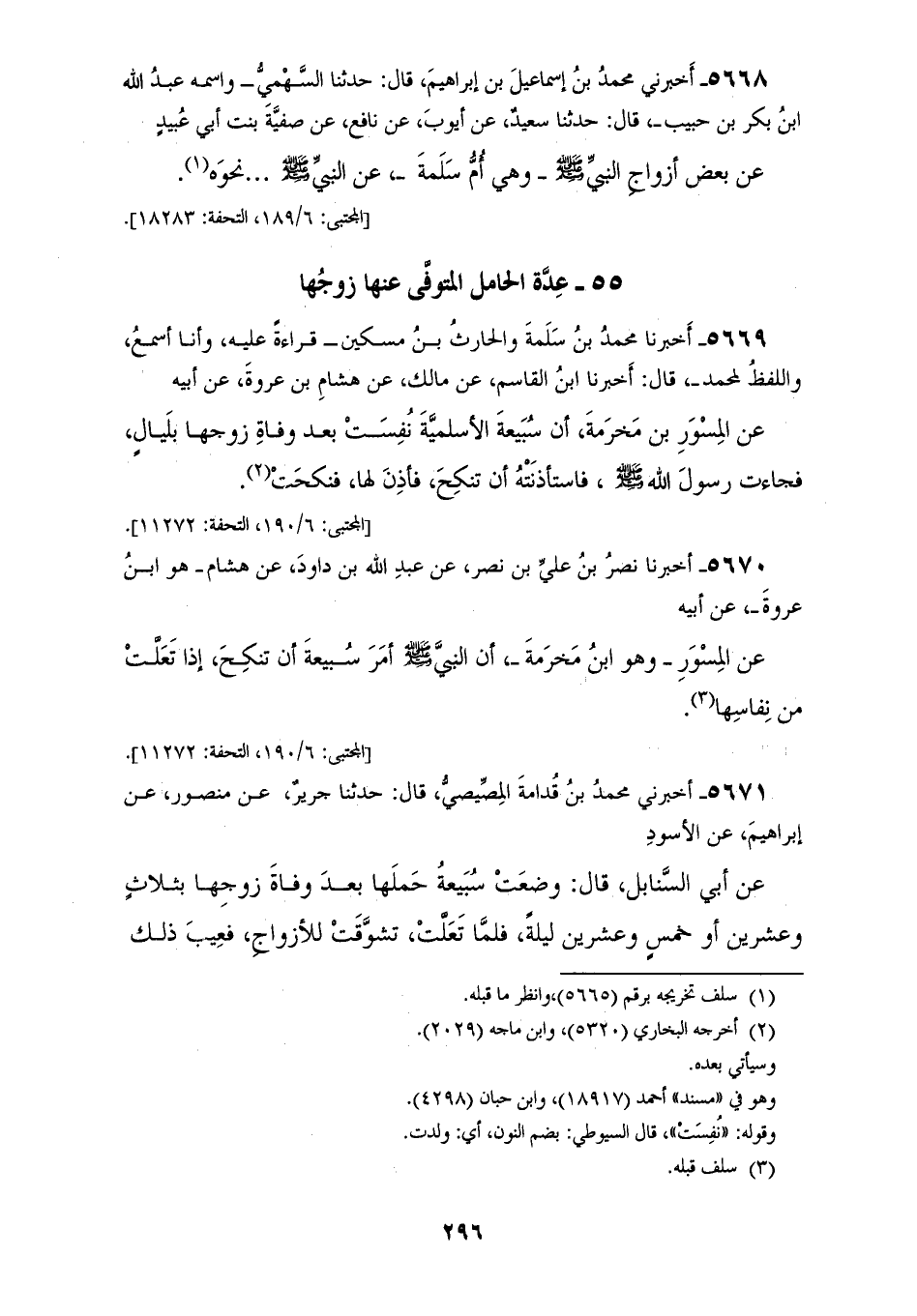 5671 - أَخْبَرَنِي مُحَمَّدُ بْنُ قُدَامَةَ الْمِصِّيصِيُّ، قَالَ: حَدَّثَنَا جَرِيرٌ، عَنْ مَنْصُورٍ، عَنْ إِبْرَاهِيمَ، عَنِ الْأَسْوَدِ، عَنْ أَبِي السَّنَابِلِ، قَالَ: وَضَعَتْ سُبَيْعَةُ حَمْلَهَا بَعْدَ وَفَاةِ زَوْجِهَا بِثَلَاثَةٍ وَعِشْرِينَ أَوْ خَمْسَةٍ وَعِشْرِينَ لَيْلَةً، فَلَمَّا تَعَلَّتْ تَشَوَّقَتْ لِلْأَزْوَاجِ فَعِيبَ ذَلِكَ عَلَيْهَا، فَذُكِرَ ذَلِكَ لِرَسُولِ اللهِ صَلَّى اللهُ عَلَيْهِ وَسَلَّمَ فَقَالَ: «§مَا يَمْنَعُهَا قَدِ انْقَضَى أَجَلُهَا»