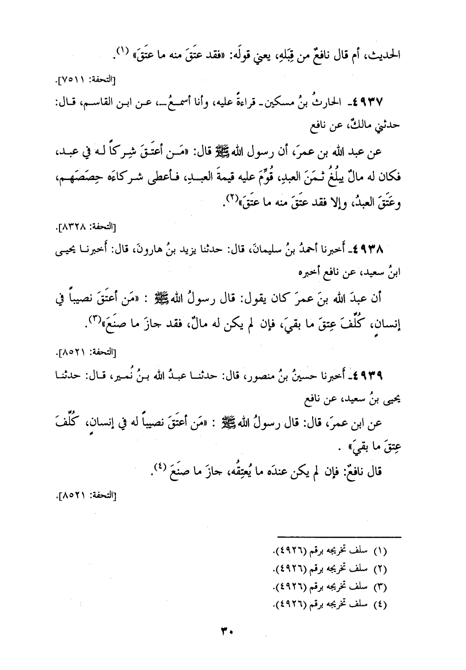 4938 - أَخْبَرَنَا أَحْمَدُ بْنُ سُلَيْمَانَ، قَالَ: حَدَّثَنَا يَزِيدُ بْنُ هَارُونَ، قَالَ: أَخْبَرَنَا يَحْيَى بْنُ سَعِيدٍ، عَنْ نَافِعٍ، أَخْبَرَهُ أَنَّ عَبْدَ اللهِ بْنَ عُمَرَ كَانَ يَقُولُ: قَالَ رَسُولُ اللهِ صَلَّى اللهُ عَلَيْهِ وَسَلَّمَ: «§مَنْ أَعْتَقَ نَصِيبًا فِي إِنْسَانٍ كُلِّفَ عِتْقَ مَا بَقِيَ فَإِنْ لَمْ يَكُنْ لَهُ مَالٌ، فَقَدْ جَازَ مَا صَنَعَ»