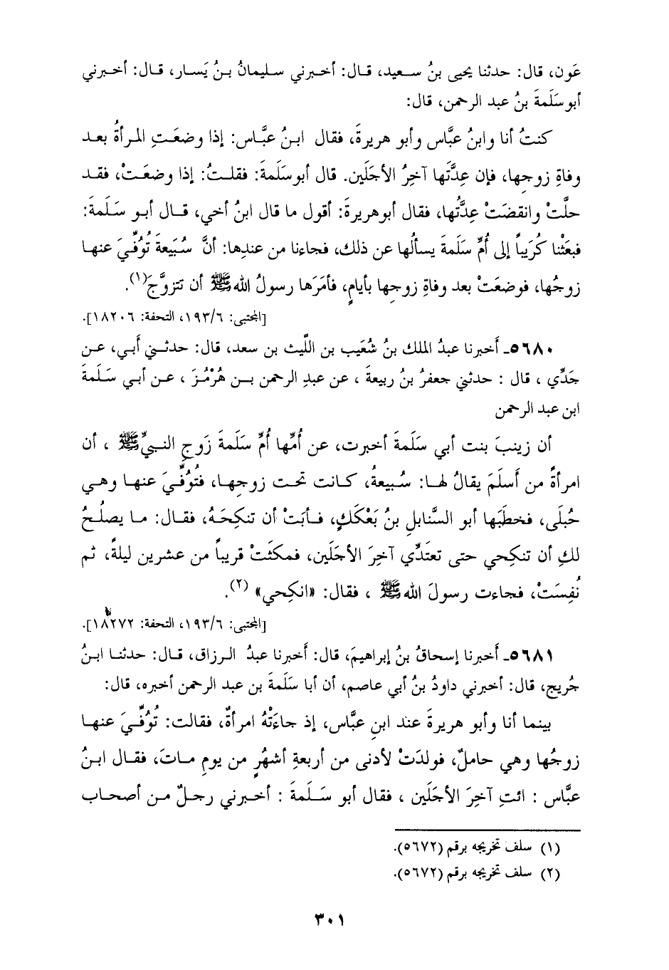 5679 - أَخْبَرَنَا حُسَيْنُ بْنُ مَنْصُورِ بْنِ جَعْفَرٍ النَّيْسَابُورِيُّ، قَالَ: حَدَّثَنَا جَعْفَرُ بْنُ عَوْنٍ، قَالَ: حَدَّثَنَا يَحْيَى بْنُ سَعِيدٍ، قَالَ: أَخْبَرَنِي سُلَيْمَانُ بْنُ يَسَارٍ، قَالَ: أَخْبَرَنِي أَبُو سَلَمَةَ بْنُ عَبْدِ الرَّحْمَنِ، قَالَ: كُنْتُ أَخْبَرَنَا وَابْنُ عَبَّاسٍ، وَأَبُو هُرَيْرَةَ، فَقَالَ ابْنُ عَبَّاسٍ: إِذَا وَضَعَتِ الْمَرْأَةُ بَعْدَ وَفَاةِ زَوْجِهَا فَإِنَّ عِدَّتَهَا آخِرُ الْأَجَلَيْنِ، قَالَ أَبُو سَلَمَةَ: فَقُلْتُ إِذَا وَضَعَتْ فَقَدْ حَلَّتْ، وَانْقَضَتْ عِدَّتُهَا، فَقَالَ أَبُو هُرَيْرَةَ: أَقُولُ مَا قَالَ ابْنُ أَخِي، فَقَالَ أَبُو سَلَمَةَ: فَبَعَثْنَا كُرَيْبًا إِلَى أُمِّ سَلَمَةَ يَسْأَلُهَا عَنْ ذَلِكَ، فَجَاءَنَا مِنْ عِنْدِهَا أَنَّ سُبَيْعَةَ تُوُفِّيَ عَنْهَا زَوْجُهَا فَوَضَعَتْ بَعْدَ وَفَاةِ زَوْجِهَا بِأَيَّامٍ «§فَأَمَرَهَا رَسُولُ اللهِ صَلَّى اللهُ عَلَيْهِ وَسَلَّمَ أَنْ تَتَزَوَّجَ»