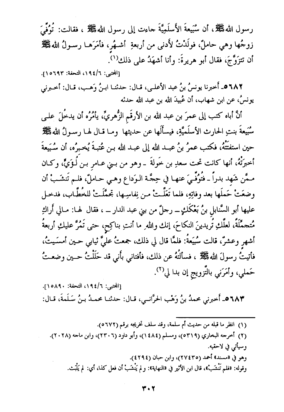 5682 - أَخْبَرَنَا يُونُسُ بْنُ عَبْدِ الْأَعْلَى، قَالَ: حَدَّثَنَا ابْنُ وَهْبٍ، قَالَ: أَخْبَرَنِي يُونُسُ، عَنِ ابْنِ شِهَابٍ، أَنَّ عُبَيْدَ اللهِ بْنَ عَبْدِ اللهِ، حَدَّثَهُ أَنَّ أَبَاهُ كَتَبَ إِلَى عُمَرَ بْنِ عَبْدِ اللهِ بْنِ الْأَرْقَمَ الزُّهْرِيِّ يَأْمُرُهُ أَنْ يَدْخُلَ عَلَى سُبَيْعَةَ بِنْتِ الْحَارِثِ الْأَسْلَمِيَّةِ، فَيَسْأَلَهَا عَنْ حَدِيثِهَا وَمَا قَالَ لَهَا رَسُولُ اللهِ صَلَّى اللهُ عَلَيْهِ وَسَلَّمَ حِينَ اسْتَفْتَتْهُ، فَكَتَبَ عُمَرُ بْنُ عَبْدِ اللهِ إِلَى عَبْدِ اللهِ بْنِ عُتْبَةَ يُخْبِرُهُ أَنَّ سُبَيْعَةَ أَخْبَرَتْهُ أَنَّهَا كَانَتْ تَحْتَ سَعْدِ بْنِ خَوْلَةَ، وَهُوَ مِنْ بَنِي عَامِرِ بْنِ لُؤَيٍّ، وَكَانَ مِمَّنْ شَهِدَ بَدْرًا، فَتُوُفِّيَ عَنْهَا فِي حَجَّةِ الْوَدَاعِ، وَهِيَ حَامِلٌ فَلَمْ تَنْشَبْ أَنْ وَضَعَتْ حَمْلَهَا بَعْدَ وَفَاتِهِ، فَلَمَّا تَعَلَّتْ مِنْ نِفَاسِهَا تَجَمَّلَتْ لِلْخُطَّابِ، فَدَخَلَ عَلَيْهَا أَبُو السَّنَابِلِ بْنُ بَعْكَكٍ رَجُلٌ مِنْ بَنِي عَبْدِ الدَّارِ، فَقَالَ لَهَا: مَالِي أَرَاكِ مُتَجَمِّلَةً لَعَلَّكِ تُرِيدِينَ النِّكَاحَ، إِنَّكِ وَاللهِ مَا أَنْتِ بِنَاكِحٍ حَتَّى تَمُرَّ عَلَيْكِ أَرْبَعَةُ أَشْهُرٍ وَعَشْرٌ، قَالَتْ سُبَيْعَةُ: فَلَمَّا قَالَ لِي ذَلِكَ جَمَعْتُ عَلَيَّ ثِيَابِي حِينَ أَمْسَيْتُ، فَأَتَيْتُ رَسُولَ اللهِ صَلَّى اللهُ عَلَيْهِ وَسَلَّمَ، فَسَأَلْتُهُ عَنْ ذَلِكَ، فَأَفْتَانِي بِأَنِّي قَدْ حَلَلْتُ حِينَ وَضَعْتُ حَمْلِي، «§وَأَمَرَنِي بِالتَّزْوِيجِ إِنْ بَدَا لِي»