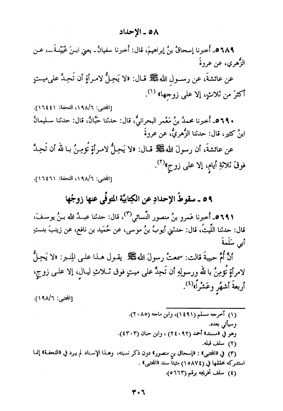 5689 - أَخْبَرَنَا إِسْحَاقُ بْنُ إِبْرَاهِيمَ، قَالَ: أَخْبَرَنَا سُفْيَانُ يَعْنِي ابْنَ عُيَيْنَةَ، عَنِ الزُّهْرِيِّ، عَنْ عُرْوَةَ، عَنْ عَائِشَةَ، عَنْ رَسُولِ اللهِ صَلَّى اللهُ عَلَيْهِ وَسَلَّمَ قَالَ: «§لَا يَحِلُّ لِامْرَأَةٍ أَنْ تُحِدَّ عَلَى مَيِّتٍ أَكْثَرَ مِنْ ثَلَاثٍ إِلَّا عَلَى زَوْجِهَا»