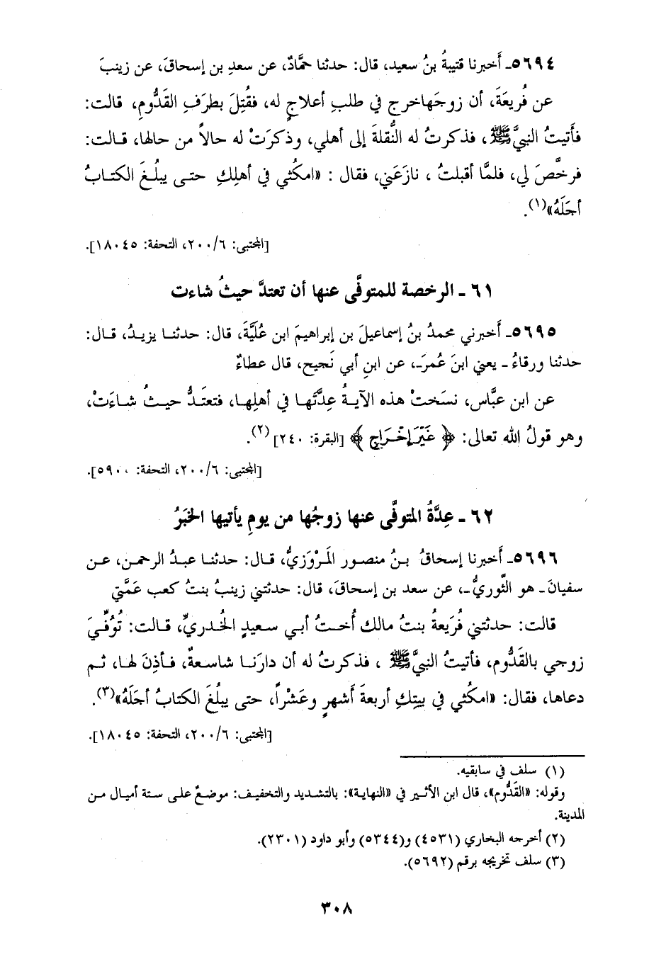 5694 - أَخْبَرَنَا قُتَيْبَةُ بْنُ سَعِيدٍ، قَالَ: حَدَّثَنَا حَمَّادٌ، عَنْ سَعْدِ بْنِ إِسْحَاقَ، عَنْ زَيْنَبَ، عَنْ فُرَيْعَةَ، أَنَّ زَوْجَهَا، خَرَجَ فِي طَلَبِ أَعْلَاجٍ لَهُ، فَقُتِلَ بِطَرَفِ الْقَدُّومِ، قَالَتْ: فَأَتَيْتُ النَّبِيَّ صَلَّى اللهُ عَلَيْهِ وَسَلَّمَ فَذَكَرْتُ لَهُ النُّقْلَةَ إِلَى أَهْلِي، وَذَكَرَتُ لَهُ حَالًا مِنْ حَالِهَا، قَالَتْ: فَرَخَّصَ لِي فَلَمَّا أَقْبَلْتُ نَازَعَنِي فَقَالَ: «§امْكُثِي فِي أَهْلِكِ حَتَّى يَبْلُغَ الْكِتَابُ أَجَلَهُ»