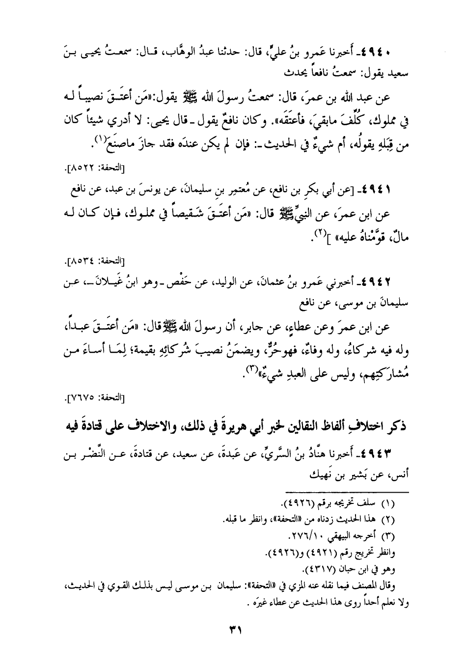 4940 - أَخْبَرَنَا عَمْرُو بْنُ عَلِيٍّ، قَالَ: حَدَّثَنَا عَبْدُ الْوَهَّابِ، قَالَ: سَمِعْتُ يَحْيَى بْنَ سَعِيدٍ، يَقُولُ: سَمِعْتُ نَافِعًا، يُحَدِّثُ عَنْ عَبْدِ اللهِ بْنِ عُمَرَ، قَالَ: سَمِعْتُ رَسُولَ اللهِ صَلَّى اللهُ عَلَيْهِ وَسَلَّمَ يَقُولُ: «§مَنْ أَعْتَقَ نَصِيبًا لَهُ فِي مَمْلُوكٍ كُلِّفَ مَا بَقِيَ فَأَعْتَقَهُ»، وَكَانَ نَافِعٌ يَقُولُ: قَالَ يَحْيَى: لَا أَدْرِي شَيْئًا كَانَ مِنْ قِبَلِهِ يَقُولُهُ أَمْ شَيْءٌ فِي الْحَدِيثِ «فَإِنْ لَمْ يَكُنْ عِنْدَهُ فَقَدْ جَازَ مَا صَنَعَ»