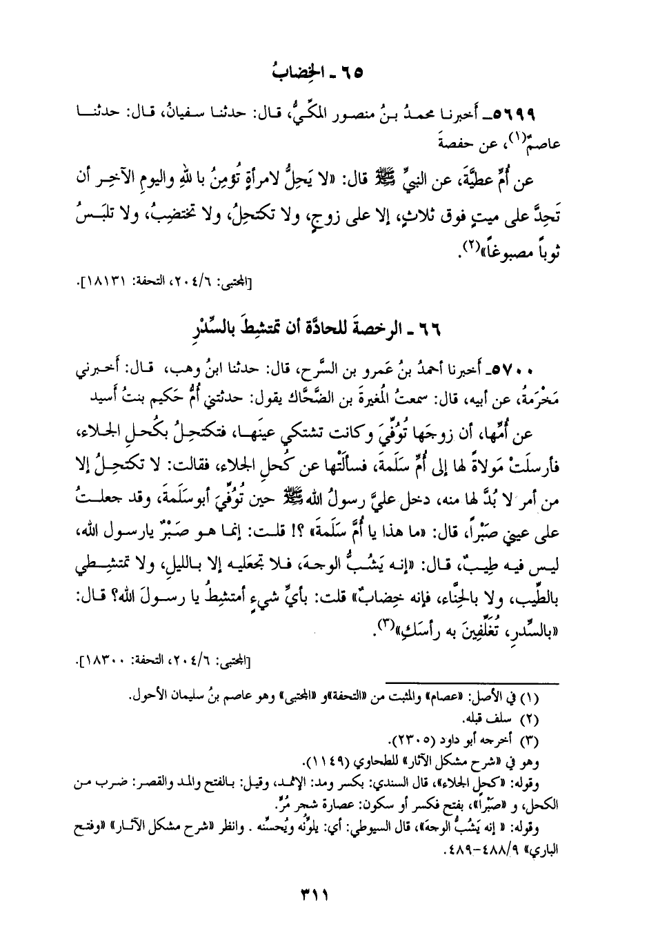 5699 - أَخْبَرَنَا مُحَمَّدُ بْنُ مَنْصُورٍ الْمَكِّيُّ، قَالَ: حَدَّثَنَا سُفْيَانُ، قَالَ: حَدَّثَنَا عَاصِمٌ، عَنْ حَفْصَةَ، عَنْ أُمِّ عَطِيَّةَ، عَنِ النَّبِيِّ صَلَّى اللهُ عَلَيْهِ وَسَلَّمَ قَالَ: «§لَا يَحِلُّ لِامْرَأَةٍ تُؤْمِنُ بِاللهِ وَالْيَوْمِ الْآخِرِ أَنْ تُحِدَّ عَلَى مَيِّتٍ فَوْقَ ثَلَاثٍ إِلَّا عَلَى زَوْجٍ، وَلَا تَكْتَحِلُ، وَلَا تَخْتَضِبُ، وَلَا تَلْبَسُ ثَوْبًا مَصْبُوغًا»
