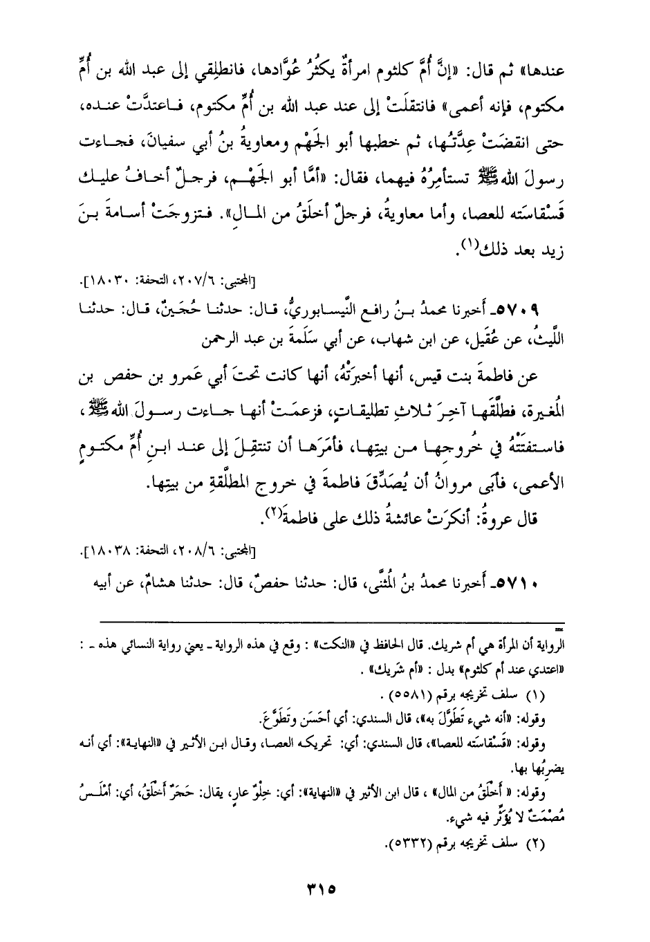 5709 - أَخْبَرَنَا مُحَمَّدُ بْنُ رَافِعٍ النَّيْسَابُورِيُّ، قَالَ: حَدَّثَنَا حُجَيْنٌ، قَالَ: حَدَّثَنَا اللَّيْثُ، عَنْ عُقَيْلٍ، عَنِ ابْنِ شِهَابٍ، عَنْ أَبِي سَلَمَةَ بْنِ عَبْدِ الرَّحْمَنِ، عَنْ فَاطِمَةَ بِنْتِ قَيْسٍ، أَنَّهَا أَخْبَرَتْهُ أَنَّهَا، كَانَتْ تَحْتَ أَبِي عَمْرِو بْنِ حَفْصِ بْنِ الْمُغِيرَةِ، فَطَلَّقَهَا آخِرَ ثَلَاثِ تَطْلِيقَاتٍ، فَزَعَمَتْ فَاطِمَةُ أَنَّهَا جَاءَتْ رَسُولَ اللهِ صَلَّى اللهُ عَلَيْهِ وَسَلَّمَ، فَاسْتَفْتَتْهُ فِي خُرُوجِهَا مِنْ بَيْتِهَا، " §فَأَمَرَهَا أَنْ تَنْتَقِلَ إِلَى عِنْدَ ابْنِ أُمِّ مَكْتُومٍ الْأَعْمَى، فَأَبَى مَرْوَانُ أَنْ يُصَدِّقَ فَاطِمَةَ فِي خُرُوجِ الْمُطَلَّقَةِ مِنْ بَيْتِهَا، قَالَ عُرْوَةُ: أَنْكَرَتْ عَائِشَةُ ذَلِكَ عَلَى فَاطِمَةَ