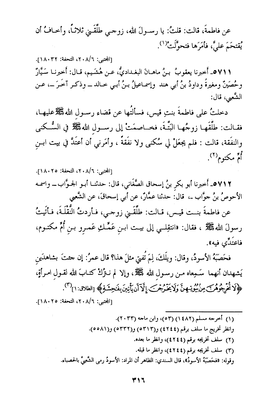 5712 - أَخْبَرَنَا أَبُو بَكْرِ بْنُ إِسْحَاقَ الصَّغَانِيُّ قَالَ: حَدَّثَنَا أَبُو الْجَوَّابِ وَاسْمُهُ الْأَحْوَصُ بْنُ جَوَّابِ، قَالَ: حَدَّثَنَا عَمَّارٌ، عَنْ أَبِي إِسْحَاقَ، عَنِ الشَّعْبِي، عَنْ فَاطِمَةَ بِنْتِ قَيْسٍ، قَالَتْ: طَلَّقَنِي زَوْجِي فَأَرَدْتُ النُّقْلَةَ، فَأَتَيْتُ رَسُولَ اللهِ صَلَّى اللهُ عَلَيْهِ وَسَلَّمَ فَقَالَ: «§انْتَقِلِي إِلَى بَيْتِ ابْنِ عَمِّكِ عَمْرِو بْنِ أُمِّ مَكْتُومٍ فَاعْتَدِّي فِيهِ» فَحَصَبَهُ الْأَسْوَدُ وَقَالَ: وَيْلَكَ لِمَ تُفْتِي مِثْلَ هَذَا، قَالَ عُمَرُ: إِنْ جِئْتَ بِشَاهِدَيْنِ يَشْهَدَانِ أَنَّهُمَا سَمِعَاهُ مِنْ رَسُولِ اللهِ صَلَّى اللهُ عَلَيْهِ وَسَلَّمَ، وَإِلَّا لَمْ نَتْرُكْ كِتَابَ اللهِ لِقَوْلِ امْرَأَةٍ {لَا تُخْرِجُوهُنَّ مِنْ بُيُوتِهِنَّ، وَلَا يَخْرُجْنَ إِلَّا أَنْ يَأْتِينَ بِفَاحِشَةٍ} [الطلاق: 1]
