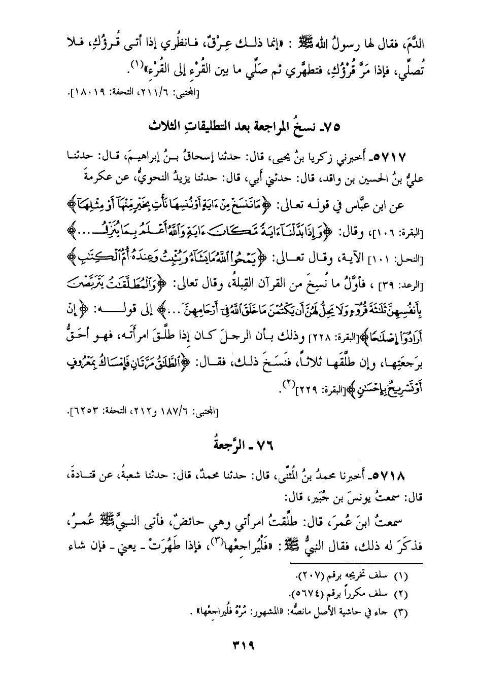 5717 - أَخْبَرَنِي زَكَرِيَّا بْنُ يَحْيَى، قَالَ: حَدَّثَنَا إِسْحَاقُ بْنُ إِبْرَاهِيمَ، قَالَ: حَدَّثَنَا عَلِيُّ بْنُ الْحُسَيْنِ بْنِ وَاقِدٍ، قَالَ: حَدَّثَنِي أَبِي، قَالَ: حَدَّثَنَا يَزِيدُ النَّحْوِيُّ، عَنْ عِكْرِمَةَ، عَنِ ابْنِ عَبَّاسٍ، فِي قَوْلِهِ تَعَالَى: {§مَا نَنْسَخْ مِنْ آيَةٍ أَوْ نُنْسِهَا نَأْتِ بِخَيْرٍ مِنْهَا أَوْ مِثْلِهَا} [البقرة: 106]، وَقَالَ: {وَإِذَا بَدَّلْنَا آيَةً مَكَانَ آيَةٍ وَاللهُ أَعْلَمُ بِمَا يُنَزِّلُ} [النحل: 101] الْآيَةَ، وَقَالَ تَعَالَى: {يَمْحُو اللهُ مَا يَشَاءُ وَيُثْبِتُ وَعِنْدَهُ أُمُّ الْكِتَابِ} [الرعد: 39] فَأَوَّلُ مَا نُسِخَ مِنَ الْقُرْآنِ الْقِبْلَةُ، وَقَالَ تَعَالَى: {وَالْمُطَلَّقَاتُ يَتَرَبَّصْنَ بِأَنْفُسِهِنَّ ثَلَاثَةَ قُرُوءٍ، وَلَا يَحِلُّ لَهُنَّ أَنْ يَكْتُمْنَ مَا خَلَقَ اللهُ فِي أَرْحَامِهِنَّ} [البقرة: 228] إِلَى قَوْلِهِ: {إِنْ أَرَادُوا إِصْلَاحًا} [البقرة: 228] وَذَلِكَ بِأَنَّ الرَّجُلَ كَانَ إِذَا طَلَّقَ امْرَأَتَهُ، فَهُوَ أَحَقُّ بِرَجْعَتِهَا، وَإِنْ طَلَّقَهَا ثَلَاثًا فَنَسَخَ ذَلِكَ فَقَالَ: {الطَّلَاقُ مَرَّتَانِ فَإِمْسَاكٌ بِمَعْرُوفٍ أَوْ تَسْرِيحٌ بِإِحْسَانٍ} [البقرة: 229]