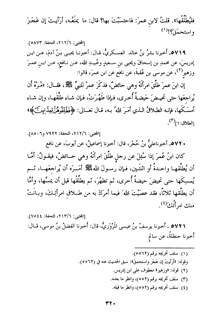 5719 - أخبرنا بِشْرُ بْنُ خَالِدٍ الْعَسْكَرِيُّ، قَالَ: أَخبرنَا يَحْيَى بْنُ آدَمَ، عَنِ ابْنِ إِدْرِيسَ، عَنْ مُحَمَّدِ بْنِ إِسْحَاقَ، وَيَحْيَى بْنُ سَعِيدٍ، وَعُبَيْدُ اللهِ، عَنْ نَافِعٍ، عَنِ ابْنِ عُمَرَ، وَزُهَيْرٌ، عَنْ مُوسَى بْنِ عُقْبَةَ، عَنْ نَافِعٍ، عَنِ ابْنِ عُمَرَ، قَالُوا: إِنَّ ابْنِ عُمَرَ، طَلَّقَ امْرَأَتَهُ وَهِيَ حَائِضٌ فَذَكَرَ عُمَرُ لِلنَّبِي صَلَّى اللهُ عَلَيْهِ وَسَلَّمَ فَقَالَ: " مُرْهُ أَنْ يُرَاجِعَهَا حَتَّى تَحِيضَ حَيْضَةً أُخْرَى، فَإِذَا طَهُرَتْ فَإِنْ شَاءَ طَلَّقَهَا، وَإِنْ شَاءَ أَمْسَكَهَا، فَإِنَّهُ الطَّلَاقٌ الَّذِي أَمَرَ اللهُ بِهِ، قَالَ تَعَالَى: {§فَطَلِّقُوهُنَّ لِعِدَّتِهِنَّ} [الطلاق: 1]