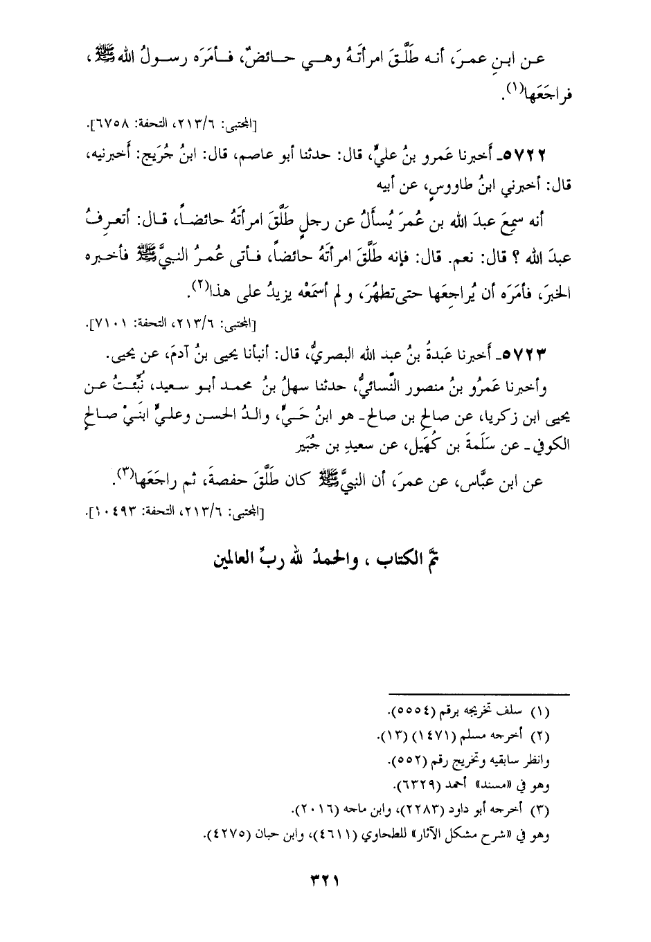 5722 - أَخْبَرَنَا عَمْرُو بْنُ عَلِيٍّ، قَالَ: حَدَّثَنَا أَبُو عَاصِمٍ، قَالَ ابْنُ جُرَيْجٍ أَخْبَرَنِيهِ، قَالَ: أَخْبَرَنِي ابْنُ طَاوُسٍ، عَنْ أَبِيهِ، أَنَّهُ سَمِعَ عَبْدَ اللهِ بْنَ عُمَرَ، يَسْأَلُ عَنْ رَجُلٍ، طَلَّقَ امْرَأَتَهُ حَائِضًا، فَقَالَ: أَتَعْرِفُ عَبْدَ اللهِ؟، قَالَ: نَعَمْ، قَالَ: فَإِنَّهُ طَلَّقَ امْرَأَتَهُ حَائِضًا، فَأَتَى عُمَرُ النَّبِيَّ صَلَّى اللهُ عَلَيْهِ وَسَلَّمَ، فَأَخْبَرَهُ الْخَبَرَ «§فَأَمَرَهُ أَنْ يُرَاجِعَهَا حَتَّى تَطْهُرَ، وَلَمْ أَسْمَعْهُ يَزِيدُ عَلَى هَذَا»