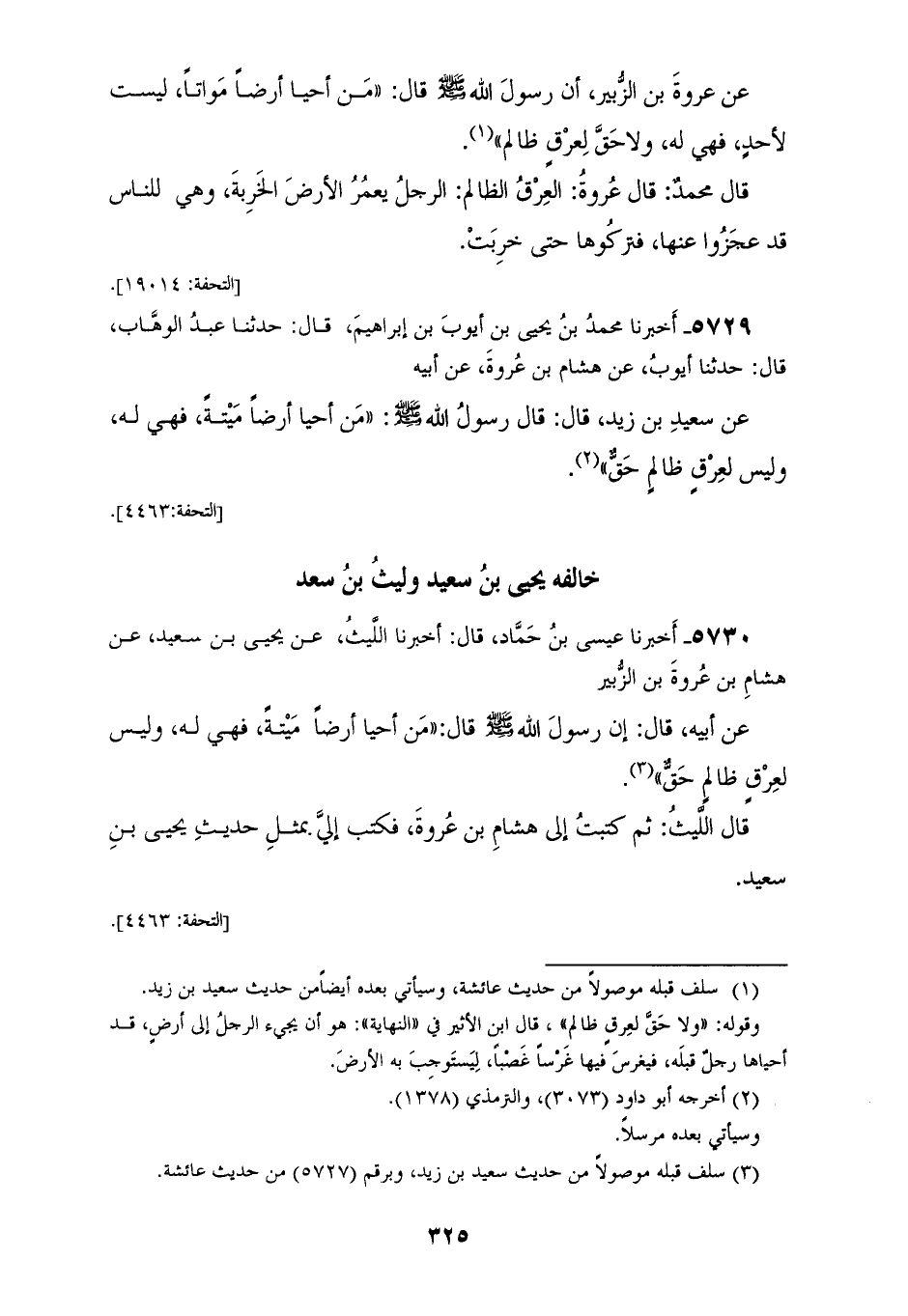 5730 - أَخْبَرَنَا عِيسَى بْنُ حَمَّادٍ، قَالَ: أَخْبَرَنَا اللَّيْثُ، عَنْ يَحْيَى بْنِ سَعِيدٍ، عَنْ هِشَامِ بْنِ عُرْوَةَ بْنِ الزُّبَيْرِ، عَنْ أَبِيهِ، قَالَ: إِنَّ رَسُولَ اللهِ صَلَّى اللهُ عَلَيْهِ وَسَلَّمَ قَالَ: «§مَنْ أَحْيَا أَرْضًا مَيِّتَةً، فَهِيَ لَهُ وَلَيْسَ لِعِرْقٍ ظَالِمٍ حَقٌّ»، قَالَ اللَّيْثُ: ثُمَّ كَتَبْتُ إِلَى هِشَامِ بْنِ عُرْوَةَ، فَكَتَبَ إِلَيَّ بِمِثْلِ حَدِيثِ يَحْيَى بْنِ سَعِيدٍ