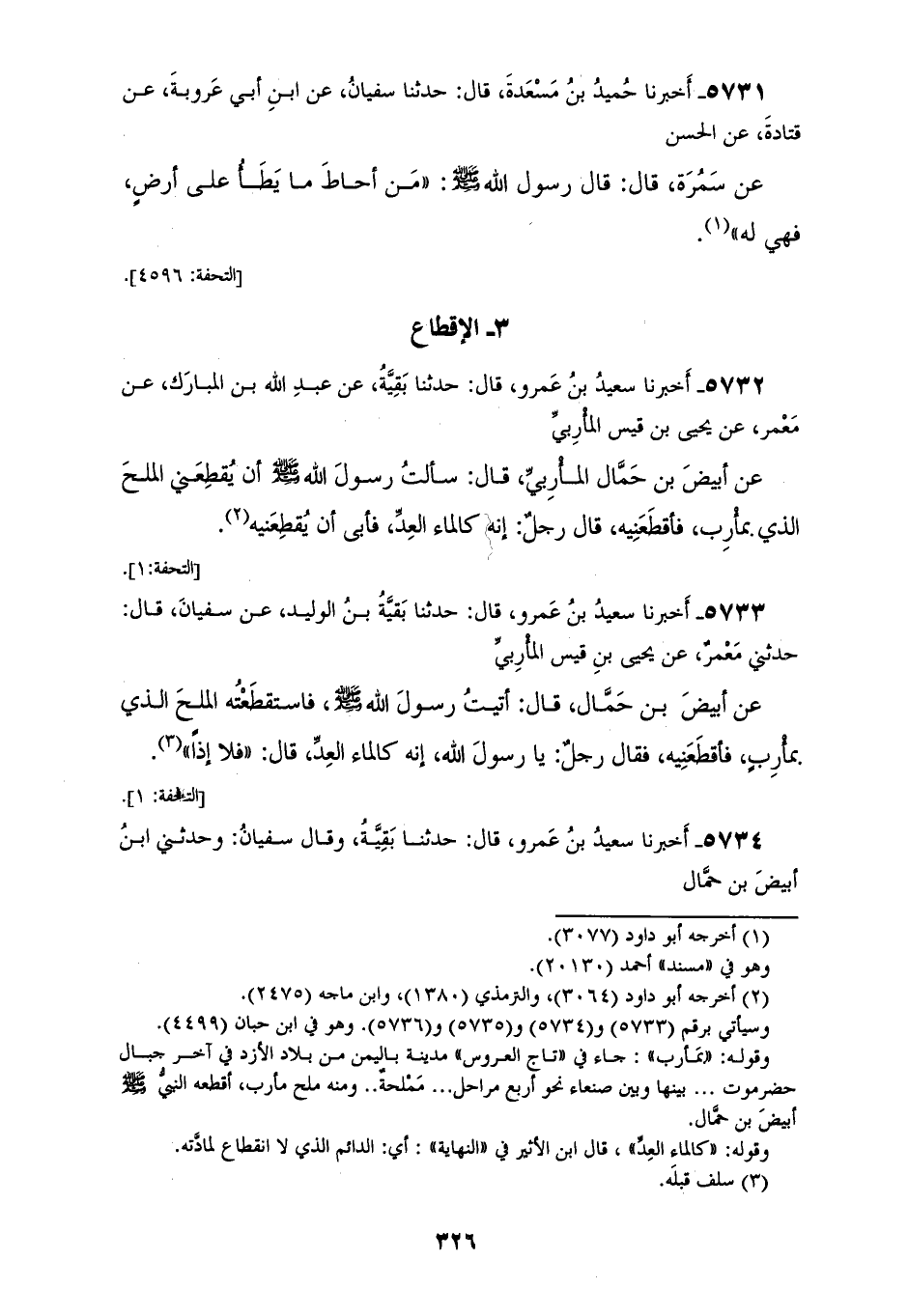 5733 - أَخْبَرَنَا سَعِيدُ بْنُ عَمْرٍو، قَالَ: حَدَّثَنَا بَقِيَّةُ بْنُ الْوَلِيدِ، عَنْ سُفْيَانَ، قَالَ: حَدَّثَنِي مَعْمَرٌ، عَنْ يَحْيَى بْنِ قَيْسٍ الْمَأْرَبِيِّ، عَنْ أَبْيَضَ بْنِ حَمَّالٍ، قَالَ: أَتَيْتُ رَسُولَ اللهِ صَلَّى اللهُ عَلَيْهِ وَسَلَّمَ، §فَاسْتَقْطَعْتُهُ الْمِلْحَ الَّذِي بِمَأْرِبَ فَأَقْطَعَنِيهِ، فَقَالَ رَجُلٌ: يَا رَسُولَ اللهِ إِنَّهُ كَالْمَاءِ الْعِدِّ قَالَ: «فَلَا إِذًا»