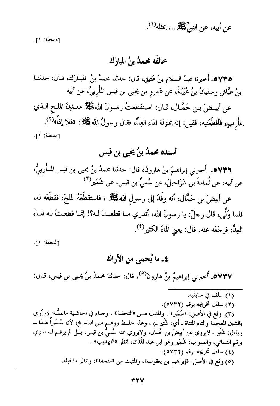 5736 - أَخْبَرَنِي إِبْرَاهِيمُ بْنُ هَارُونَ، قَالَ: حَدَّثَنَا مُحَمَّدُ بْنُ يَحْيَى بْنِ قَيْسٍ الْمَأْرَبِيُّ، عَنْ أَبِيهِ، عَنْ ثُمَامَةَ بْنِ شَرَاحِيلَ، عَنْ سُمَيِّ بْنِ قَيْسٍ، عَنْ شُمَيْرٍ، عَنْ أَبْيَضَ بْنِ حَمَّالٍ، أَنَّهُ وَفَدَ إِلَى رَسُولِ اللهِ صَلَّى اللهُ عَلَيْهِ وَسَلَّمَ فَاسْتَقْطَعَهُ الْمِلْحَ، فَقَطَعَهُ لَهُ " فَلَمَّا وَلَّى، قَالَ رَجُلٌ: يَا رَسُولَ اللهِ، §أَتَدْرِي مَا قَطَعْتَ لَهُ؟ إِنَّمَا قَطَعْتَ لَهُ الْمَاءَ الْعِدَّ، فَرَجَعَهُ عَنْهُ، قَالَ: يَعْنِي بِالْمَاءِ الْكَثِيرِ "