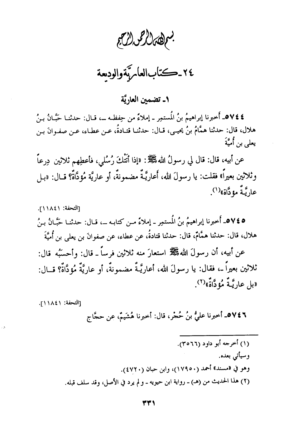 5745 - أَخْبَرَنَا إِبْرَاهِيمُ بْنُ الْمُسْتَمِرِّ إِمْلَاءً مِنْ كِتَابِهِ، قَالَ: حَدَّثَنَا حَبَّانَ بْنِ هِلَالٍ، قَالَ: حَدَّثَنَا هَمَّامٍ، قَالَ: حَدَّثَنَا قَتَادَةَ، عَنْ عَطَاءٍ عَنْ صَفْوَانَ بْنِ يَعْلَى بْنِ أُمَيَّةَ، عَنْ أَبِيهِ أَنَّ رَسُولَ اللهِ صَلَّى اللهُ عَلَيْهِ وَسَلَّمَ §اسْتَعَارَ مِنْهُ ثَلَاثِينَ فَرَسًا قَالَ وَأَحْسَبُهُ، قَالَ: وَثَلَاثِينَ بَعِيرًا، فَقَالَ: يَا رَسُولَ اللهِ أَعَارِيَةٌ مَضْمُونَةٌ أَوْ عَارِيَةٌ مُؤَدَّاةٌ؟، قَالَ: «بَلْ عَارِيَةٌ مُؤَدَّاةٌ»