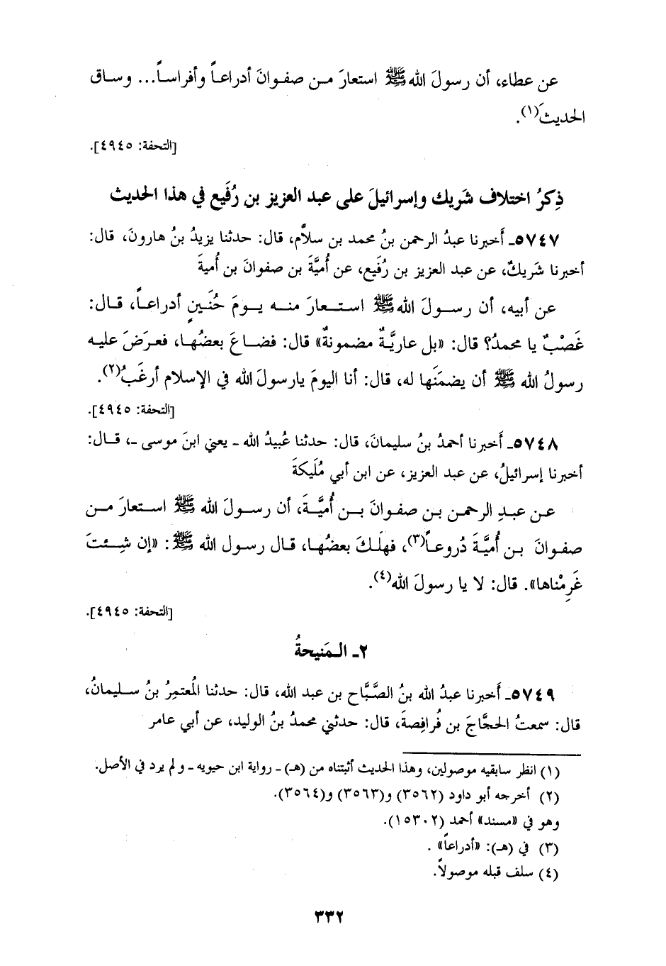 5746 - أَخْبَرَنَا عَلِيُّ بْنُ حُجْرٍ، قَالَ: أَخْبَرَنَا هُشَيْمٍ، عَنْ حَجَّاجٍ، عَنْ عَطَاءٍ، أَنَّ رَسُولَ اللهِ صَلَّى اللهُ عَلَيْهِ وَسَلَّمَ §اسْتَعَارَ مِنْ صَفْوَانَ أَدْرُعًا وَأَفْرَاسًا. . . . وَسَاقَ الْحَدِيثَ
