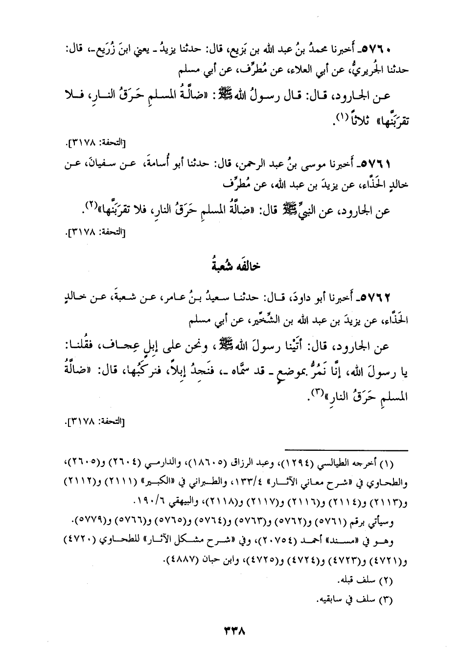 5761 - أَخْبَرَنَا مُوسَى بْنُ عَبْدِ الرَّحْمَنِ، قَالَ: حَدَّثَنَا أَبُو أُسَامَةَ، عَنْ سُفْيَانَ، عَنْ خَالِدِ الْحَذَّاءِ، عَنْ يَزِيدَ بْنِ عَبْدِ اللهِ، عَنْ مُطَرِّفٍ، عَنِ الْجَارُودِ، عَنِ النَّبِيِّ صَلَّى اللهُ عَلَيْهِ وَسَلَّمَ قَالَ: «§ضَالَّةُ الْمُسْلِمِ حَرَقُ النَّارِ فَلَا تَقْرَبَنَّهَا» خَالَفَهُ شُعْبَةُ
