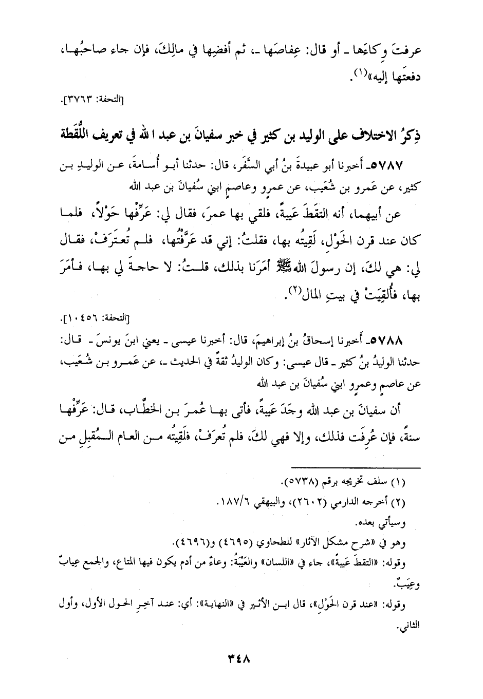 5788 - أَخْبَرَنَا إِسْحَاقُ بْنُ إِبْرَاهِيمَ، قَالَ: أَخْبَرَنَا عِيسَى يَعْنِي ابْنَ يُونُسَ، قَالَ: حَدَّثَنَا الْوَلِيدُ بْنُ كَثِيرٍ، قَالَ: عِيسَى، وَكَانَ الْوَلِيدُ ثِقَةً فِي الْحَدِيثِ، عَنْ عَمْرِو بْنِ شُعَيْبٍ، عَنْ عَاصِمٍ، وَعَمْرٍو ابْنَيْ سُفْيَانَ بْنِ عَبْدِ اللهِ أَنَّ سُفْيَانَ بْنَ عَبْدِ اللهِ، وَجَدَ عَيْبَةً فَأَتَى بِهَا عُمَرَ بْنَ الْخَطَّابِ، قَالَ: عَرِّفْهَا سَنَةً فَإِنْ عُرِفَتْ فَذَلِكَ وَإِلَّا فَهِيَ لَكَ، فَلَمْ تُعْرَفْ فَلَقِيتُهُ مِنَ الْعَامِ الْمُقْبِلِ مِنَ الْمَوْسِمِ فَذَكَرْتُهَا لَهُ فَقَالَ: §هِيَ لَكَ إِنَّ رَسُولَ اللهِ صَلَّى اللهُ عَلَيْهِ وَسَلَّمَ «أَمَرَنَا بِذَلِكَ» قَالَ: لَا حَاجَةَ لِي بِهَا، فَقَبَضَهَا عُمَرُ وَجَعَلَهَا فِي بَيْتِ الْمَالِ
