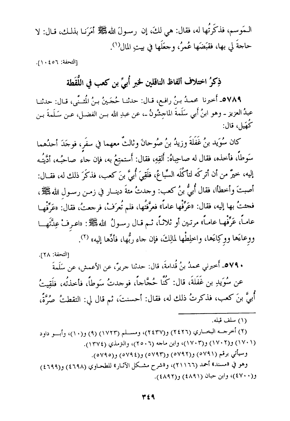 5789 - أَخْبَرَنَا مُحَمَّدُ بْنُ رَافِعٍ، قَالَ: حَدَّثَنَا حُجَيْنُ بْنُ الْمُثَنَّى، قَالَ: حَدَّثَنَا عَبْدُ الْعَزِيزِ وَهُوَ ابْنُ أَبِي سَلَمَةَ الْمَاجِشُونِ، عَنْ عَبْدِ اللهِ بْنِ الْفَضْلِ، عَنْ سَلَمَةَ بْنِ كُهَيْلٍ، قَالَ: كَانَ سُوَيْدُ بْنُ غَفَلَةَ، وَزِيدُ بْنُ صُوحَانَ، وَثَالِثٌ مَعَهُمَا فِي سَفَرٍ فَوَجَدَ أَحَدُهُمَا سَوْطًا، فَأَخَذَهُ، فَقَالَ لَهُ صَاحِبَاهُ: أَلْقِهِ، فَقَالَ: أَسْتَمْتِعْ بِهِ فَإِنْ جَاءَ صَاحِبُهُ أَدَّيْتُهُ إِلَيْهِ خَيْرٌ مِنْ أَنْ أَتْرُكَهُ لِتَأْكُلَهُ السِّبَاعُ، فَلَقِيَ أُبَيَّ بْنَ كَعْبٍ، فَذَكَرَ ذَلِكَ لَهُ، فَقَالَ: أَصَبْتَ وَأَخْطَأَ، فَقَالَ: أُبَيُّ بْنُ كَعْبٍ: وَجَدْتُ مِائَةَ دِينَارٍ فِي زَمَنِ رَسُولِ اللهِ صَلَّى اللهُ عَلَيْهِ وَسَلَّمَ فَجِئْتُ بِهَا إِلَيْهِ فَقَالَ: «§عَرِّفْهَا عَامًا» فَعَرَّفْتُهَا فَلَمْ تُعْرَفْ فَرَجَعْتُ، فَقَالَ: «عَرِّفْهَا عَامًا عَرِّفْهَا عَامًا» مَرَّتَيْنِ أَوْ ثَلَاثًا، ثُمَّ قَالَ رَسُولُ اللهِ صَلَّى اللهُ عَلَيْهِ وَسَلَّمَ: «اعْرِفْ عِدَّتَهَا وَوِعَاءَهَا، وَوِكَاءَهَا، وَاخْلِطْهَا لِمَالِكِ، فَإِنْ جَاءَ رَبُّهَا، فَأَدِّهَا إِلَيْهِ»