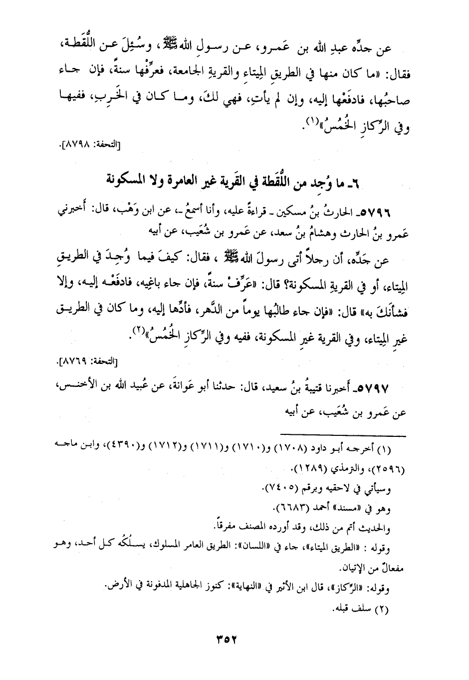 5796 - الْحَارِثُ بْنُ مِسْكِينٍ قِرَاءَةً عَلَيْهِ وَأَنَا أَسْمَعُ، عَنِ ابْنِ وَهْبٍ، قَالَ: أَخْبَرَنِي عَمْرُو بْنُ الْحَارِثِ، وَهِشَامُ بْنُ سَعْدٍ، عَنْ عَمْرِو بْنِ شُعَيْبٍ، عَنْ أَبِيهِ، عَنْ جَدِّهِ، أَنَّ رَجُلًا، أَتَى رَسُولَ اللهِ صَلَّى اللهُ عَلَيْهِ وَسَلَّمَ فَقَالَ: كَيْفَ فِيمَا وُجِدَ فِي الطَّرِيقِ الْمِيتَاءِ أَوْ فِي الْقَرْيَةِ الْمَسْكُونَةِ؟ قَالَ: «§عَرِّفْ سَنَةً، فَإِنْ جَاءَ بَاغِيَةٌ فَادْفَعْهُ إِلَيْهِ وَإِلَّا فَشَأْنُكَ بِهِ»، قَالَ: «فَإِنْ جَاءَ طَالِبُهَا يَوْمًا مِنَ الدَّهْرِ فَأَدِّهَا إِلَيْهِ، وَمَا كَانَ فِي الطَّرِيقِ غَيْرِ الْمِيتَاءِ، وَفِي الْقَرْيَةِ غَيْرِ الْمَسْكُونَةِ فَفِيهِ، وَفِي الرِّكَازِ الْخُمُسُ»
