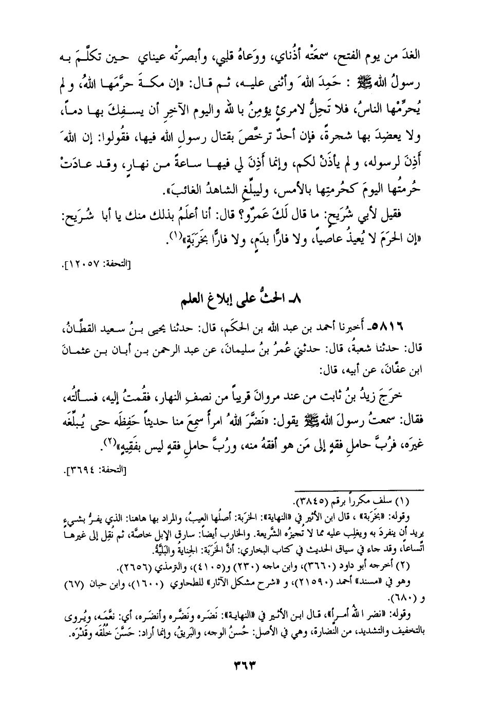 5816 - أَخْبَرَنَا أحَمَدُ بْنُ عَبْدِ اللهِ بْنِ عَبْدِ الْحَكَمِ، قَالَ: حَدَّثَنَا يَحْيَى بْنُ سَعِيدٍ الْقَطَّانُ، قَالَ: حَدَّثَنَا شُعْبَةُ، قَالَ: حَدَّثَنِي عُمَرُ بْنُ سُلَيْمَانَ، عَنْ عَبْدِ الرَّحْمَنِ بْنِ أَبَانَ بْنِ عُثْمَانَ بْنِ عَفَّانَ، عَنْ أَبِيهِ، قَالَ: خَرَجَ زَيْدُ بْنُ ثَابِتٍ مِنْ عِنْدِ مَرْوَانَ قَرِيبًا مِنْ نِصْفِ النَّهَارِ، فَقُمْتُ إِلَيْهِ فَسَأَلْتُهُ، فَقَالَ: سَمِعْتُ رَسُولَ اللهِ صَلَّى اللهُ عَلَيْهِ وَسَلَّمَ يَقُولُ: «§نَضَّرَ اللهُ امْرَأً سَمِعَ مِنَّا حَدِيثًا حَفِظَهُ حَتَّى يُبَلِّغَهُ غَيْرَهُ، فَرُبَّ حَامِلِ فِقْهٍ إِلَى مَنْ هُوَ أَفْقَهُ مِنْهُ، وَرُبَّ حَامِلِ فِقْهٍ لَيْسَ بِفَقِيهٍ»