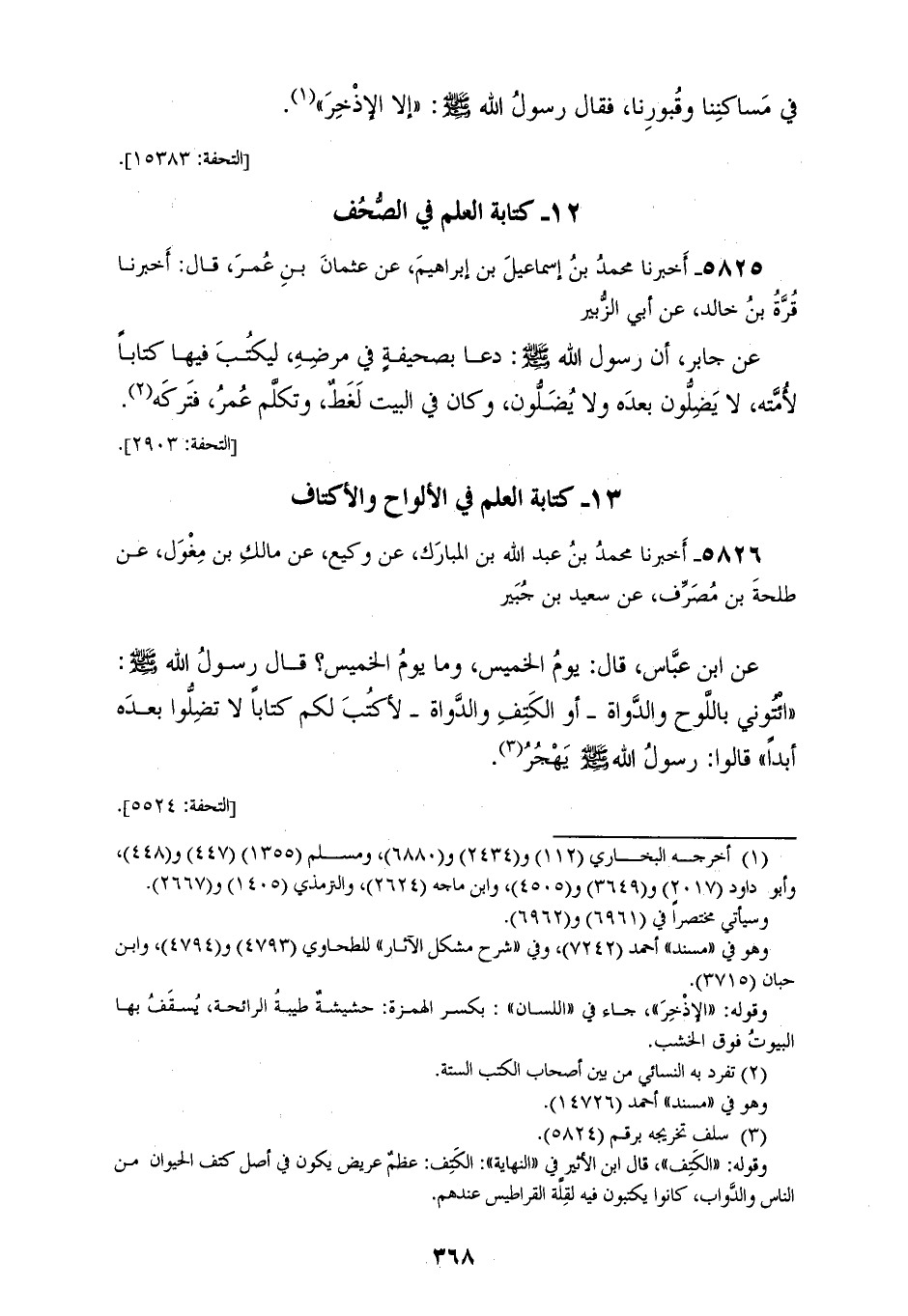 5826 - أَخْبَرَنَا مُحَمَّدُ بْنُ عَبْدِ اللهِ بْنِ الْمُبَارَكِ، عَنْ وَكِيعٍ، عَنْ مَالِكِ بْنِ مِغْوَلٍ، عَنْ طَلْحَةَ بْنِ مُصَرِّفٍ، عَنْ سَعِيدِ بْنِ جُبَيْرٍ، عَنِ ابْنِ عَبَّاسٍ، قَالَ: يَوْمُ الْخَمِيسِ وَمَا يَوْمُ الْخَمِيسِ قَالَ رَسُولُ اللهِ صَلَّى اللهُ عَلَيْهِ وَسَلَّمَ: «§ائْتُونِي بِاللَّوْحِ، وَالدَّوَاةِ، أَوِ الْكَتِفِ، وَالدَّوَاةِ لِأَكْتُبَ لَكُمْ كِتَابًا لَا تَضِلُّوا بَعْدَهُ أَبَدًا» قَالُوا: رَسُولُ اللهِ صَلَّى اللهُ عَلَيْهِ وَسَلَّمَ يَهْجُرُ
