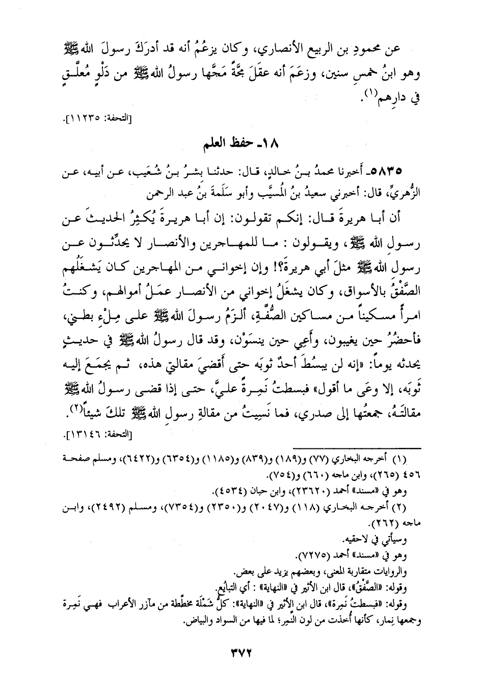 5835 - أَخْبَرَنَا مُحَمَّدُ بْنُ خَالِدٍ، قَالَ: حَدَّثَنَا بِشْرُ بْنُ شُعَيْبٍ، عَنْ أَبِيهِ، عَنِ الزُّهْرِيِّ، قَالَ أَخْبَرَنِي سَعِيدُ بْنُ الْمُسَيِّبِ، وَأَبُو سَلَمَةَ بْنُ عَبْدِ الرَّحْمَنِ أَنَّ أَبَا هُرَيْرَةَ، قَالَ: إِنَّكُمْ تَقُولُونَ إِنَّ أَبَا هُرَيْرَةَ يُكْثِرُ الْحَدِيثَ عَنْ رَسُولِ اللهِ صَلَّى اللهُ عَلَيْهِ وَسَلَّمَ وَيَقُولُونَ: مَا لِلْمُهَاجِرِينَ، وَالْأَنْصَارِ لَا يُحَدِّثُونَ عَنْ رَسُولِ اللهِ صَلَّى اللهُ عَلَيْهِ وَسَلَّمَ مِثْلَ أَبِي هُرَيْرَةَ، وَأَنَّ إِخْوَانِي مِنَ الْمُهَاجِرِينَ كَانَ يَشْغَلُهُمُ الصَّفْقُ بِالْأَسْوَاقِ، وَكَانَ يَشْغَلُ إِخْوَانِي مِنَ الْأَنْصَارِ عَمَلُ أَمْوَالِهِمْ، وَكُنْتُ امْرَأً مِسْكِينًا مِنْ مَسَاكِينِ الصُّفَّةِ أَلْزَمُ رَسُولَ اللهِ صَلَّى اللهُ عَلَيْهِ وَسَلَّمَ عَلَى مِلْءِ بَطْنِي، فَأَحْضُرُ حِينَ يَغِيبُونَ، وَأَعِي حِينَ يَنْسَوْنَ، وَقَدْ قَالَ رَسُولُ اللهِ صَلَّى اللهُ عَلَيْهِ وَسَلَّمَ فِي حَدِيثٍ يُحَدِّثُهُ يَوْمًا إِنَّهُ: «§لَنْ يَبْسُطَ أَحَدٌ ثَوْبَهُ حَتَّى أَقْضِيَ مَقَالَتِي هَذِهِ، ثُمَّ يَجْمَعُ إِلَيْهِ ثَوْبَهُ إِلَّا وَعَى مَا أَقُولُ»، فَبَسَطْتُ نَمِرَةً عَلَيَّ حَتَّى إِذَا قَضَى رَسُولُ اللهِ صَلَّى اللهُ عَلَيْهِ وَسَلَّمَ مَقَالَتَهُ جَمَعْتُهَا إِلَى صَدْرِي فَمَا نَسِيتُ مِنْ مَقَالَةِ رَسُولِ اللهِ صَلَّى اللهُ عَلَيْهِ وَسَلَّمَ تِلْكَ شَيْئًا