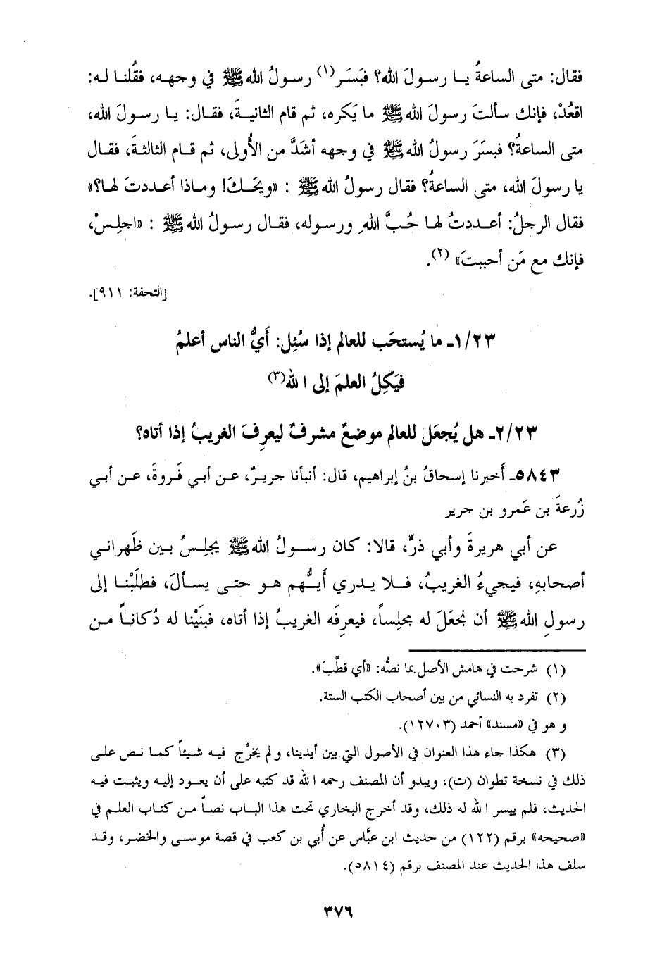 §مَا يُسْتَحَبُّ لِلْعَالَمِ إِذَا سُئِلَ أَيُّ النَّاسِ أَعْلَمُ فَيَكِلُ الْعِلْمَ إِلَى اللهِ، هَلْ يُجْعَلُ لِلْعَالَمِ مَوْضِعٌ مُشَرَّفٌ لِيَعْرِفَ الْغَرِيبُ إِذَا أَتَاهُ