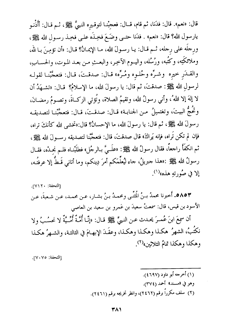 5852 - أَخْبَرَنَا أَبُو دَاوُدَ، قَالَ: حَدَّثَنَا يَزِيدُ بْنُ هَارُونَ، قَالَ: أَنْبَأَنَا شَرِيكٌ، عَنِ الرُّكَيْنِ بْنِ الرَّبِيعِ، عَنْ يَحْيَى بْنِ يَعْمُرَ، وَعَنْ عَطَاءِ بْنِ السَّائِبِ، عَنِ ابْنِ بُرَيْدَةَ، قَالَ: حَجَجْنَا وَاعْتَمَرْنَا، ثُمَّ قَدِمْنَا الْمَدِينَةَ، فَأَتَيْنَا ابْنَ عُمَرَ فَسَأَلْنَاهُ، فَقُلْنَا: يَا أَبَا عَبْدِ الرَّحْمَنِ إِنَّا نَغْزُو فِي هَذِهِ الْأَرْضِ، فَنَلْقَى قَوْمًا يَقُولُونَ: لَا قَدْرَ، فَأَعْرَضَ بِوَجْهِهِ عَنَّا، ثُمَّ قَالَ: إِذَا لَقِيتَ أُولَئِكَ فَاعْلَمْ أَنَّ عَبْدَ اللهِ بْنَ عُمَرَ مِنْهُمْ بَرِيءٌ، وَإِنَّهُمْ مِنْهُ بَرَاءٌ، ثُمَّ قَالَ: بَيْنَا نَحْنُ عِنْدَ رَسُولِ اللهِ صَلَّى اللهُ عَلَيْهِ وَسَلَّمَ إِذْ جَاءَ رَجُلٌ قَدْ أَقْبَلَ حَسَنُ الْوَجْهِ حَسَنُ الشَّارَةِ طَيِّبُ الرِّيحِ، قَالَ: فَعَجِبْنَا لِحُسْنِ وَجْهِهِ وَشَارَتِهِ، وَطِيبِ رِيحِهِ، فَسَلَّمَ عَلَى النَّبِيِّ صَلَّى اللهُ عَلَيْهِ وَسَلَّمَ ثُمَّ قَامَ، فَقَالَ: أَأَدْنُو يَا رَسُولَ اللهِ؟، قَالَ: «نَعَمْ»، قَالَ: فَدَنَا ثُمَّ قَامَ، قَالَ: فَعَجِبْنَا لِتَوْقِيرِهِ النَّبِيَّ صَلَّى اللهُ عَلَيْهِ وَسَلَّمَ ثُمَّ قَالَ: أَأَدْنُو يَا رَسُولَ اللهِ؟، قَالَ: نَعَمْ فَدَنَا حَتَّى وَضَعَ، فَخِذَهُ عَلَى فَخِذِ رَسُولِ اللهِ صَلَّى اللهُ عَلَيْهِ وَسَلَّمَ وَرِجْلَهُ عَلَى رِجْلِهِ، ثُمَّ قَالَ: يَا رَسُولَ اللهِ مَا الْإِيمَانُ؟، قَالَ: أَنْ تُؤْمِنَ بِاللهِ وَمَلَائِكَتِهِ وَكُتُبِهِ وَرُسُلِهِ وَالْيَوْمِ الْآخِرِ وَالْبَعْثِ مِنْ بَعْدِ الْمَوْتِ، وَالْحِسَابِ وَالْقَدَرِ خَيْرِهِ وَشَرِّهِ وَحُلْوِهِ وَمُرِّهِ، قَالَ: صَدَقْتَ، قَالَ: فَتَعَجَّبْنَا لِقَوْلِهِ لِرَسُولِ اللهِ صَلَّى اللهُ عَلَيْهِ وَسَلَّمَ صَدَقْتَ، ثُمَّ قَالَ: يَا رَسُولَ اللهِ مَا الْإِسْلَامُ؟، قَالَ: تَشْهَدُ أَنَّ لَا إِلَهَ إِلَّا اللهُ، وَأَنِّي رَسُولُ اللهِ، وَتُقِيمَ الصَّلَاةَ، وَتُؤْتِيَ الزَّكَاةَ، وَتَصُومَ رَمَضَانَ، وَتَحُجَّ الْبَيْتَ، وَتَغْتَسِلَ مِنَ الْجَنَابَةِ، قَالَ: صَدَقْتَ، قَالَ: فَتَعَجَّبْنَا لِتَصْدِيقِهِ رَسُولَ اللهِ صَلَّى اللهُ عَلَيْهِ وَسَلَّمَ، ثُمَّ قَالَ: يَا رَسُولَ اللهِ مَا الْإِحْسَانُ؟، قَالَ: تَخْشَى اللهَ كَأَنَّكَ تَرَاهُ، فَإِنْ لَمْ تَكُنْ تَرَاهُ فَإِنَّهُ يَرَاكَ، قَالَ: صَدَقْتَ، قَالَ: فَتَعَجَّبْنَا لِتَصْدِيقِهِ رَسُولَ اللهِ صَلَّى اللهُ عَلَيْهِ وَسَلَّمَ، ثُمَّ انْكَفَأَ رَاجِعًا، فَقَالَ رَسُولُ اللهِ صَلَّى اللهُ عَلَيْهِ وَسَلَّمَ: «عَلَيَّ بِالرَّجُلِ»، فَطَلَبْنَاهُ فَلَمْ نَجِدْهُ، فَقَالَ رَسُولُ اللهِ صَلَّى اللهُ عَلَيْهِ وَسَلَّمَ: «§هَذَا جِبْرِيلُ جَاءَ لِيُعَلِّمَكُمْ أَمْرَ دِينِكُمْ، وَمَا أَتَانِي قَطُّ إِلَّا عَرَفْتُهُ إِلَّا فِي صُورَتِهِ هَذِهِ»