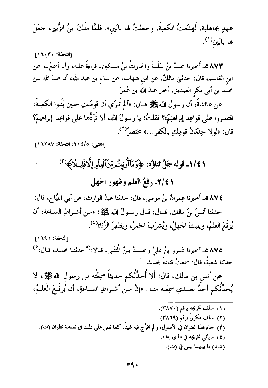 §قَوْلُهُ جَلَّ ثَنَاؤُهُ: {وَمَا أُوتِيتُمْ مِنَ الْعِلْمِ إِلَّا قَلِيلًا} [الإسراء: 85] رَفْعُ الْعِلْمِ وَظُهُورُ الْجَهْلِ