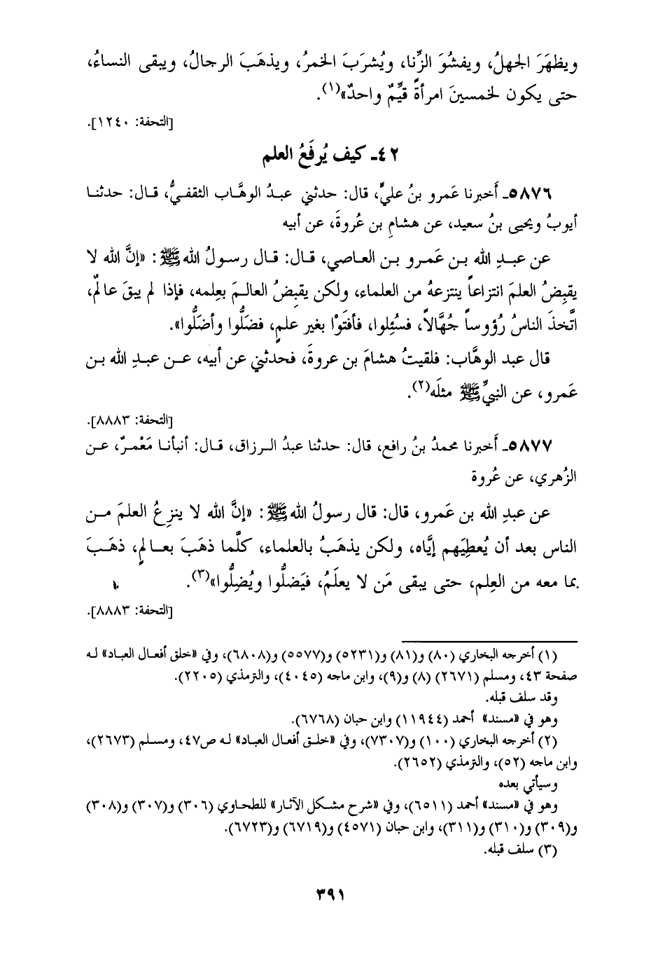 5876 - أَخْبَرَنَا عَمْرُو بْنُ عَلِيٍّ، قَالَ: حَدَّثَنِي عَبْدُ الْوَهَّابِ الثَّقَفِيُّ، قَالَ: حَدَّثَنَا أَيُّوبُ، وَيَحْيَى بْنُ سَعِيدٍ، عَنْ هِشَامِ بْنِ عُرْوَةَ، عَنْ أَبِيهِ، عَنْ عَبْدِ اللهِ بْنِ عَمْرِو بْنِ الْعَاصِي، قَالَ: قَالَ رَسُولُ اللهِ صَلَّى اللهُ عَلَيْهِ وَسَلَّمَ: «إِنَّ §اللهَ لَا يَقْبِضُ الْعِلْمَ انْتِزَاعًا يَنْتَزِعُهُ مِنَ الْعُلَمَاءِ، وَلَكِنْ يَقْبِضُ الْعَالِمَ بِعِلْمِهِ، فَإِذَا لَمْ يَبْقَ عَالِمٌ اتَّخَذَ النَّاسُ رُءُوسًا جُهَّالًا، فَسُئِلُوا فَأَفْتَوْا بِغَيْرِ عِلْمٍ فَضَلُّوا وَأَضَلُّوا» قَالَ عَبْدُ الْوَهَّابِ: فَلَقِيتُ هِشَامَ بْنَ عُرْوَةَ، فَحَدَّثَنِي، عَنْ أَبِيهِ، عَنْ عَبْدِ اللهِ بْنِ عَمْرٍو عَنِ النَّبِيِّ صَلَّى اللهُ عَلَيْهِ وَسَلَّمَ مِثْلَهُ