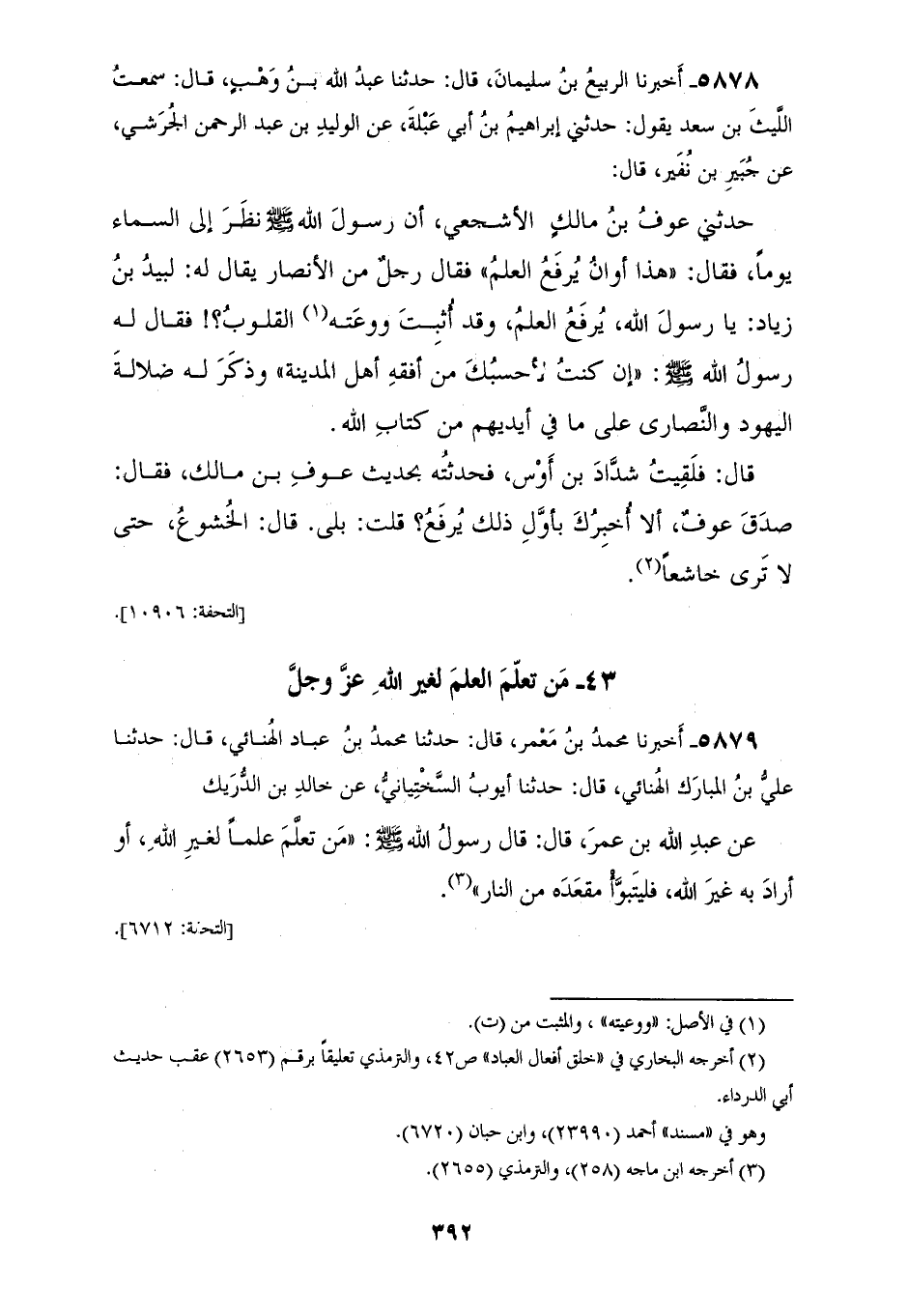 5878 - أَخْبَرَنَا الرَّبِيعُ بْنُ سُلَيْمَانَ، قَالَ: حَدَّثَنَا عَبْدُ اللهِ بْنُ وَهْبٍ، قَالَ: سَمِعْتُ اللَّيْثَ بْنَ سَعْدٍ، يَقُولُ: حَدَّثَنِي إِبْرَاهِيمُ بْنُ أَبِي عَبْلَةَ، عَنِ الْوَلِيدِ بْنِ عَبْدِ الرَّحْمَنِ الْجُرَشِيِّ، عَنْ جُبَيْرِ بْنِ نُفَيْرٍ، قَالَ: حَدَّثَنِي عَوْفُ بْنُ مَالِكٍ الْأَشْجَعِيُّ، أَنَّ رَسُولَ اللهِ صَلَّى اللهُ عَلَيْهِ وَسَلَّمَ نَظَرَ إِلَى السَّمَاءِ يَوْمًا فَقَالَ: «§هَذَا أَوَانٌ يُرْفَعُ الْعِلْمُ»، فَقَالَ رَجُلٌ مِنَ الْأَنْصَارِ يُقَالُ لَهُ: لَبِيدُ بْنُ زِيَادٍ: يَا رَسُولَ اللهِ يُرْفَعُ الْعِلْمُ وَقَدْ أُثْبِتَ وَوَعَتْهُ الْقُلُوبُ؟ فَقَالَ لَهُ رَسُولُ اللهِ صَلَّى اللهُ عَلَيْهِ وَسَلَّمَ: «إِنْ كُنْتُ لَأَحْسَبُكَ مِنْ أَفْقَهِ أَهْلِ الْمَدِينَةِ»، وَذَكَرَ لَهُ ضَلَالَةَ الْيَهُودِ، وَالنَّصَارَى عَلَى مَا فِي أَيْدِيهِمْ مِنْ كِتَابِ اللهِ، قَالَ: فَلَقِيتُ شَدَّادَ بْنَ أَوْسٍ، فَحَدَّثْتُهُ بِحَدِيثِ عَوْفِ بْنِ مَالِكٍ، فَقَالَ: صَدَقَ عَوْفٌ أَلَا أُخْبِرُكَ بِأَوَّلِ ذَلِكَ يُرْفَعُ؟، قُلْتُ: بَلَى، قَالَ: الْخُشُوعُ حَتَّى لَا تَرَى خَاشِعًا