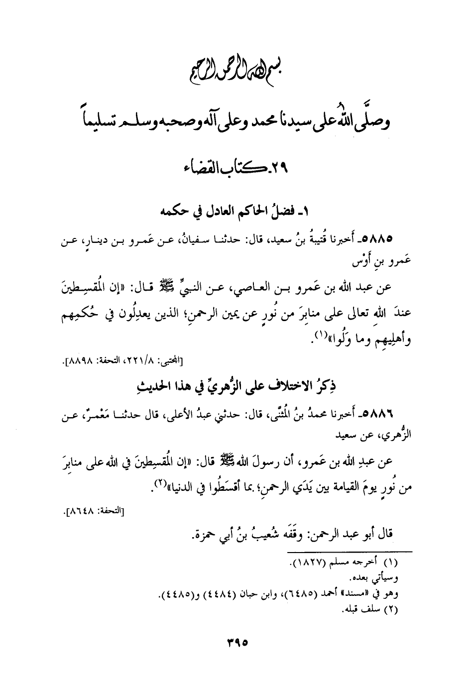 5885 - أَخْبَرَنَا قُتَيْبَةُ بْنُ سَعِيدٍ، قَالَ: حَدَّثَنَا سُفْيَانُ، عَنْ عَمْرِو بْنِ دِينَارٍ، عَنْ عَمْرِو بْنِ أَوْسٍ، عَنْ عَبْدِ اللهِ بْنِ عَمْرِو بْنِ الْعَاصِي، عَنِ النَّبِيِّ صَلَّى اللهُ عَلَيْهِ وَسَلَّمَ قَالَ: «إِنَّ §الْمُقْسِطِينَ عِنْدَ اللهِ تَعَالَى عَلَى مَنَابِرَ مِنْ نُورٍ عَنْ يَمِينِ الرَّحْمَنِ الَّذِينَ يَعْدِلُونَ فِي حُكْمِهِمْ وَأَهْلِيهِمْ وَمَا وُلُّوا»