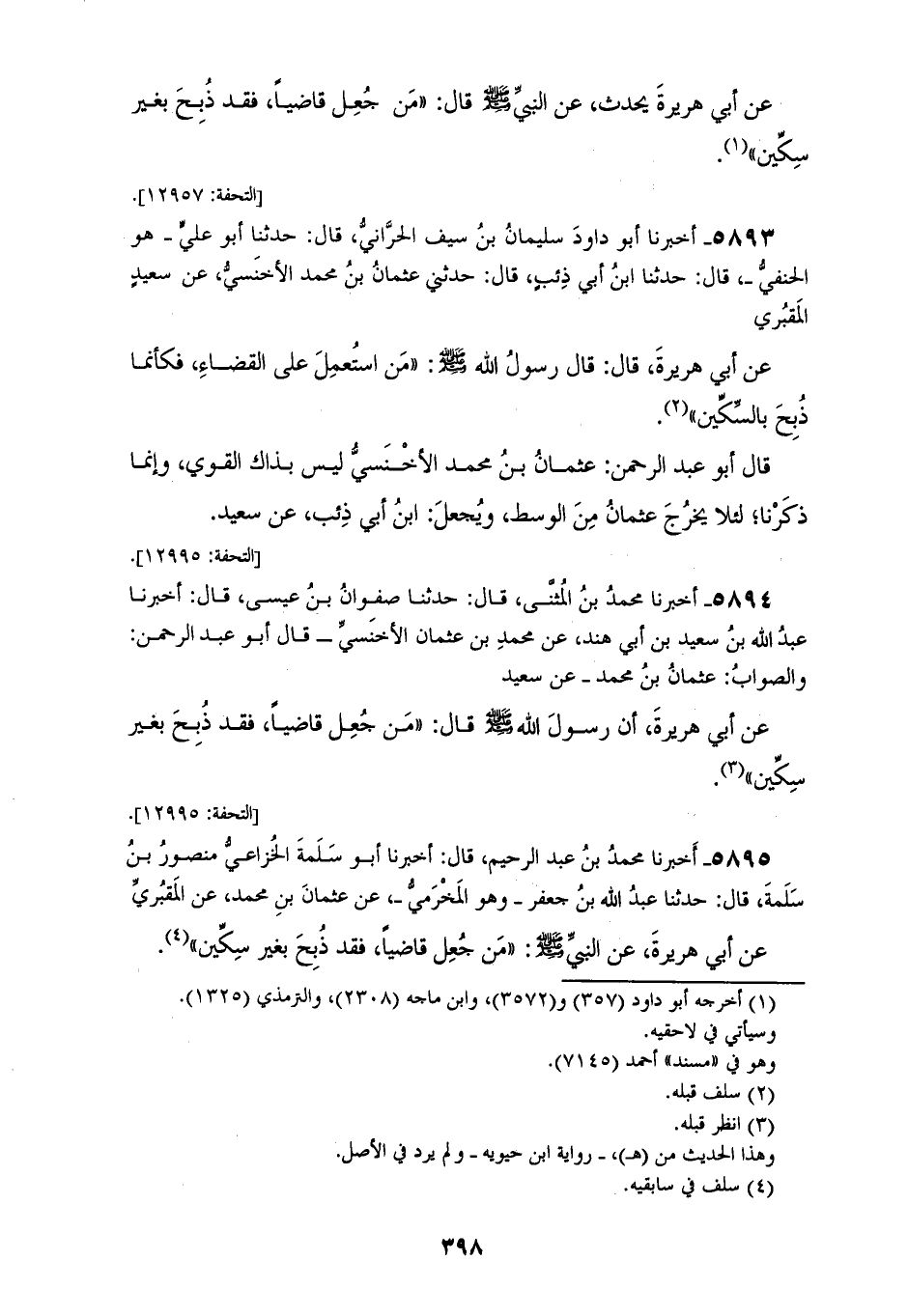 5895 - أَخْبَرَنَا مُحَمَّدُ بْنُ عَبْدِ الرَّحِيمِ، قَالَ: أَخْبَرَنَا أَبُو سَلَمَةَ الْخُزَاعِيُّ مَنْصُورُ بْنُ سَلَمَةَ، قَالَ: حَدَّثَنَا عَبْدُ اللهِ بْنُ جَعْفَرٍ وَهُوَ الْمَخْرَمِيُّ، عَنْ عُثْمَانَ بْنِ مُحَمَّدٍ، عَنِ الْمَقْبُرِيِّ، عَنْ أَبِي هُرَيْرَةَ، عَنِ النَّبِيِّ صَلَّى اللهُ عَلَيْهِ وَسَلَّمَ: «§مَنْ جُعِلَ قَاضِيًا بَيْنَ النَّاسِ فَقَدْ ذُبِحَ بِغَيْرِ سِكِّينٍ»، قَالَ أَبُو سَلَمَةَ، وَقَدْ ذَكَرَهُ مَرَّةً أَوْ مَرَّتَيْنِ، عَنِ الْأَعْرَجِ، وَالْمَقْبُرِيِّ